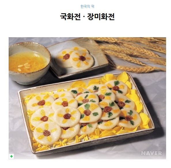 국화전은 주로 음력 9월 9일인 중양절(重陽節)에, 장미화전은 늦은 봄날이나 초여름에 찹쌀가루를 익반죽 하여 동글납작하게 모양을 만들어 노란국화꽃잎과 장미꽃잎을 붙여 번철에 기름을 두르고 지져내어 설탕시럽이나 꿀을 발라먹는 음식이다. 그윽한 향기와 자태의 아름다움으로 대개 단독으로 쓰이지 않고 편의 웃기로 많이 쓰인다. 화전은 <도문대작(屠門大嚼), 1601>에서 '전화법', '유전병'으로 처음 기록된 이래 <음식디미방, 1670>, <주방문>, <증보산림경제, 1766>, <동국세시기, 1849>, <경도잡지>, <궁중음식연회고> 등의 고조리서에 나타나 있다. 화전은 그 계절에 피는 꽃을 이용하여 진달래화전, 맨드라미화전, 배꽃전, 복숭아꽃전, 백합꽃전, 석류화전, 옥잠화전, 감국잎화전 등을 만들며 계절에 상관없이 대추, 밤, 잣, 석이, 버섯채를 고명으로 얹어서 지져내기도 한다.