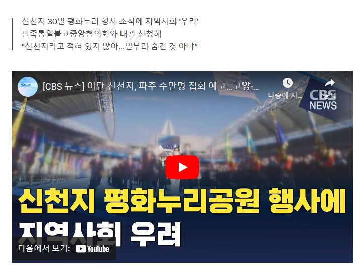 신천지, 파주 평화누리공원에서 대규모 종교행사 예정: 신천지가 10월 30일 파주 평화누리공원에서 3만 명 규모의 종교행사를 개최할 예정입니다.
