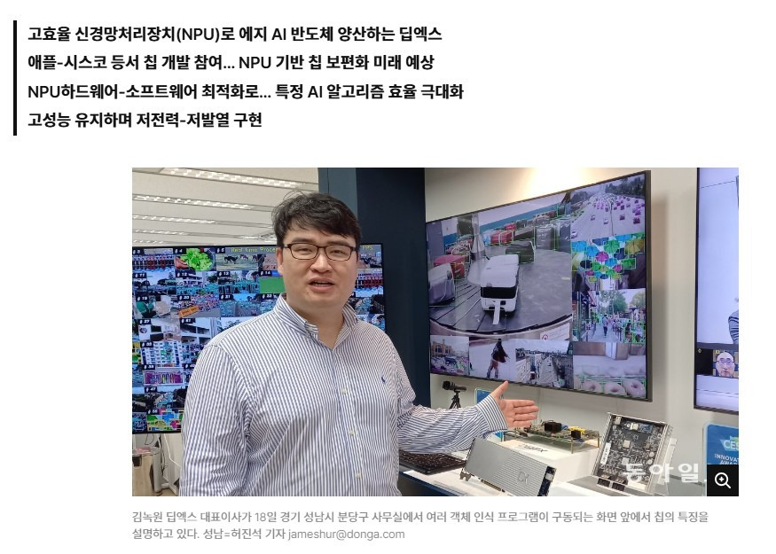 딥엑스는 신경망처리장치(NPU)를 만든다. 엔비디아가 주력으로 하는 그래픽처리장치(GPU)보다 AI 알고리즘을 더 세분화해서 특정 AI 알고리즘을 고효율로 처리할 수 있는 방식이다. 애플과 브로드컴 등 세계적인 기업에서 칩을 설계했던 김녹원 대표이사(48)가 2018년에 설립했다. 18일 경기 성남시 판교신도시의 사무실에서 만난 김 대표는 “우리가 지금은 와이파이(WiFi) 없는 삶을 상상하기 힘들 듯이, 머지않은 미래에 인간은 AI 반도체가 탑재된 전자기기에 의존하게 될 것”이라며 “인류의 삶을 바꿀 기회에 참여하고 싶어 창업했다”고 했다.