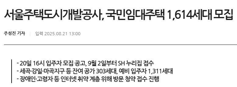 서울주택도시개발공사(SH, 사장 황상하)는 2025년 국민임대주택 1,614세대를 공급한다고 8월 20일 발표했습니다. 이번 공급은 잔여 공가 303세대와 예비 입주자 1,311세대를 대상으로 하며, 세곡·강일·마곡 등 23개 지구와 고덕온빛채·위례포레샤인 등 14개 단지가 포함됩니다.