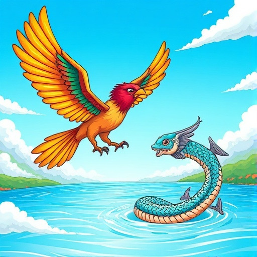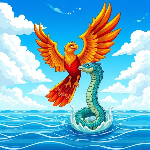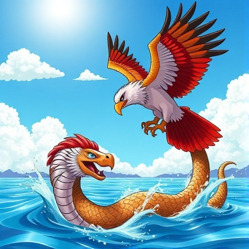 하늘과 물의 경계에서 가루다와 나가는 처음으로 마주쳤어요.