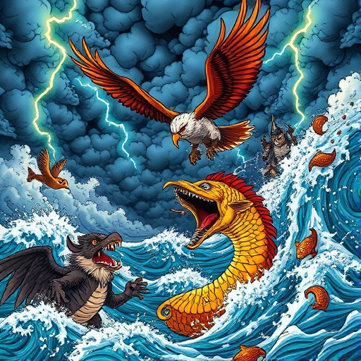 하늘과 물이 뒤섞인 폭풍 속에서 싸움은 치열해졌어요.