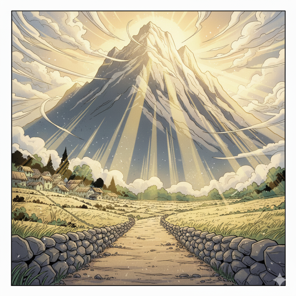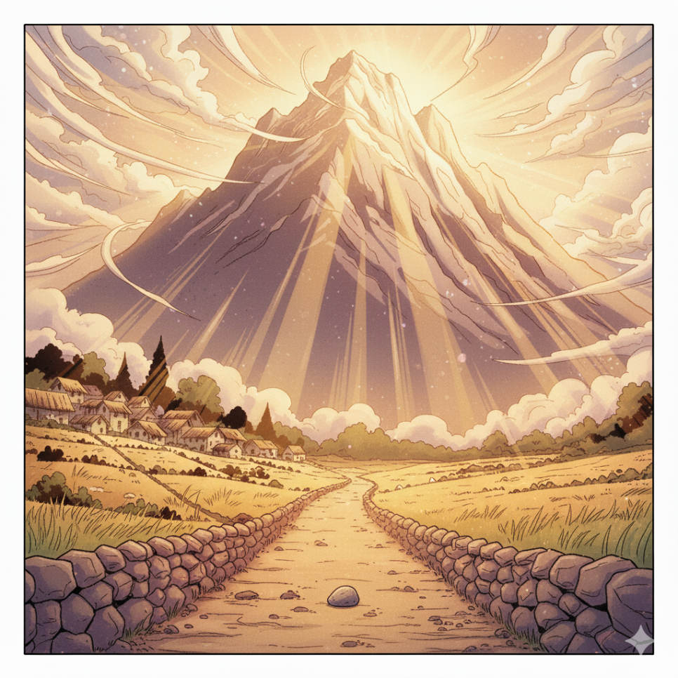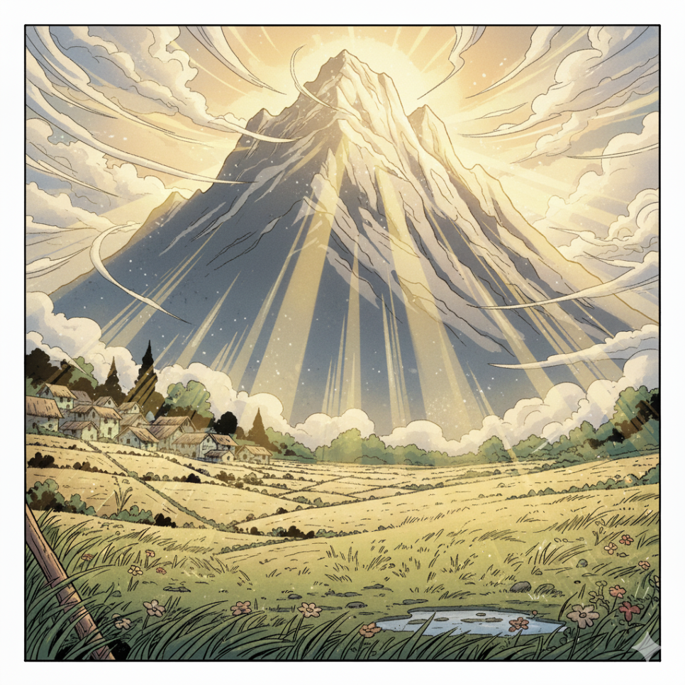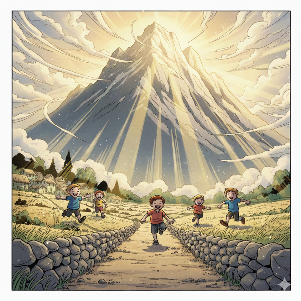 마침내 햇빛이 마을 한가운데까지 스며들었습니다. 밭에는 꽃이 피고, 엄마의 얼굴에도 생기가 돌아왔지요. 아이들은 햇살 아래에서 뛰놀았습니다. 산은 완전히 사라지지 않았지만, 더 이상 길을 막지 않았어요. 마을 사람들은 알게 되었습니다. 기적은 갑자기 오지 않는다는 것을요.