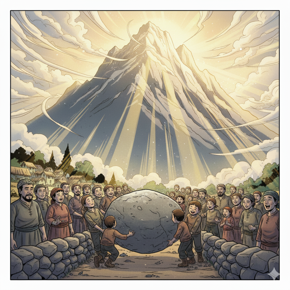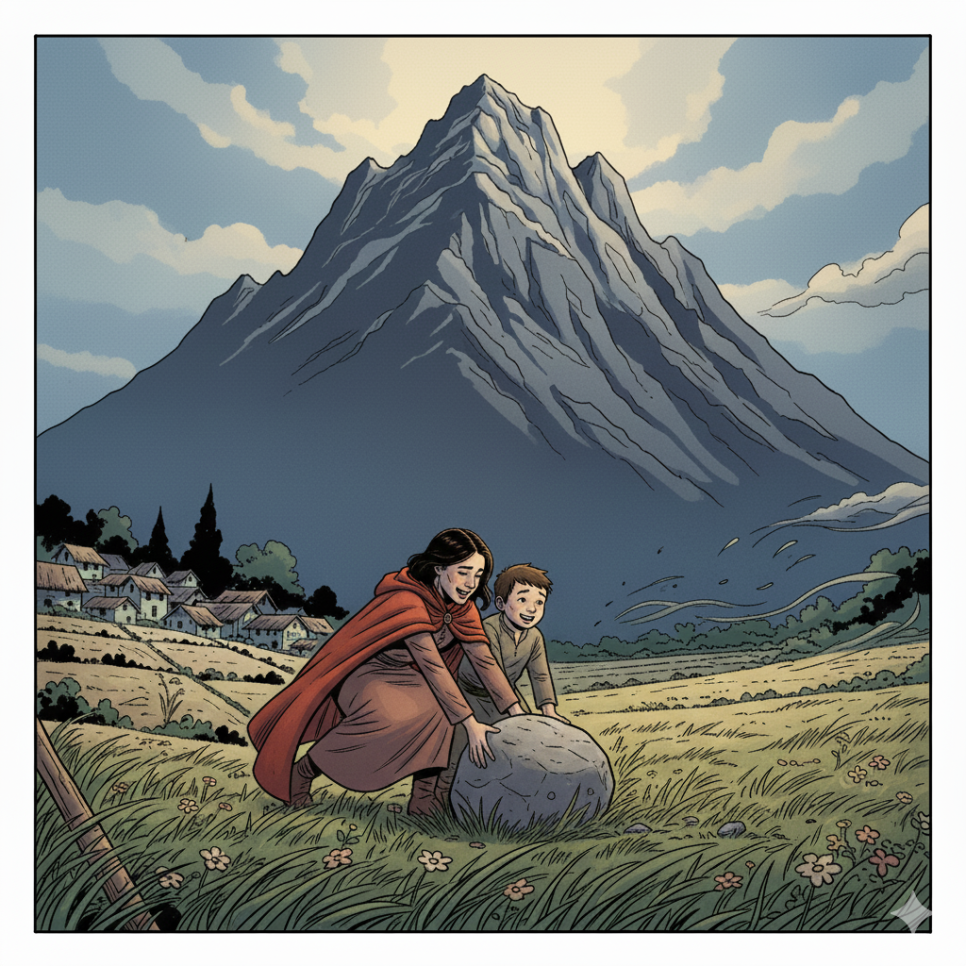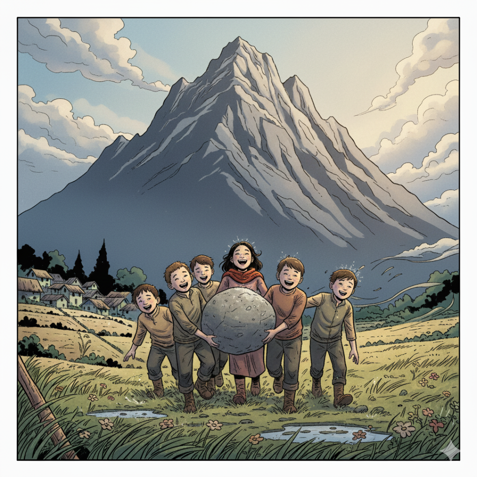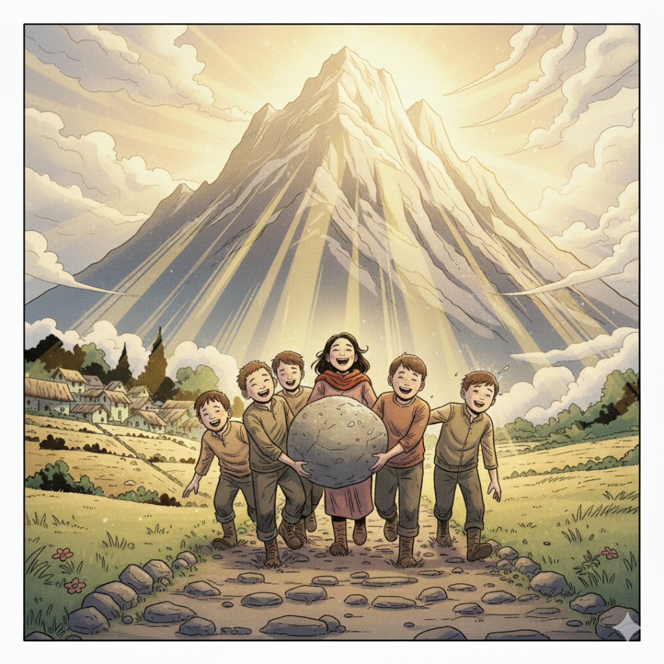 어느 날, 한 어른이 루치아 옆에 섰어요. 그리고 말없이 돌을 들었습니다. 그날 이후 마을 사람들은 하루에 하나씩 돌을 옮기기 시작했어요. 노인도, 아이도, 모두의 손이 하나로 이어졌습니다. 산은 더 빠르게 낮아졌고, 웃음소리가 마을에 가득 찼지요. 루치아는 그 모습을 보며 눈시울이 뜨거워졌어요.