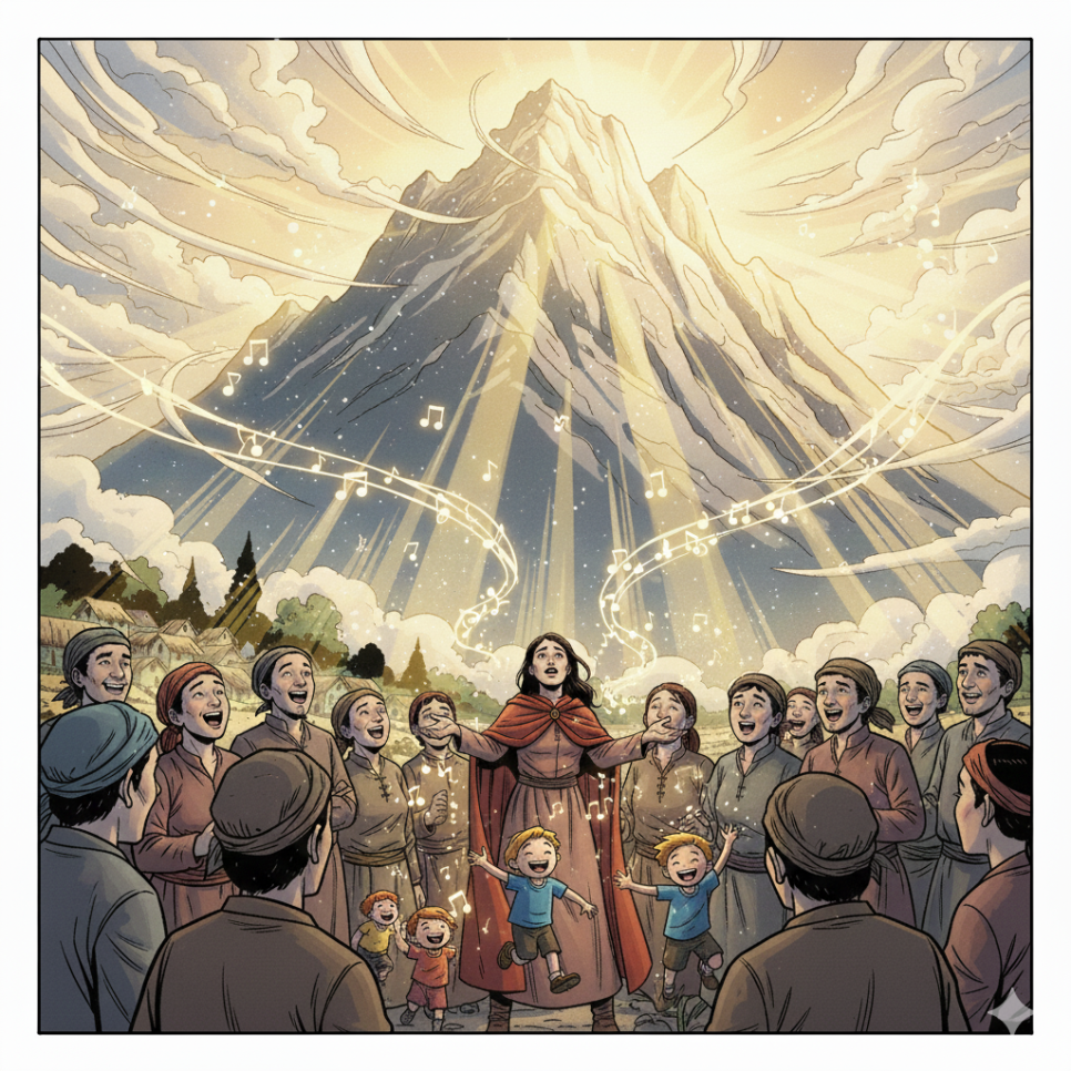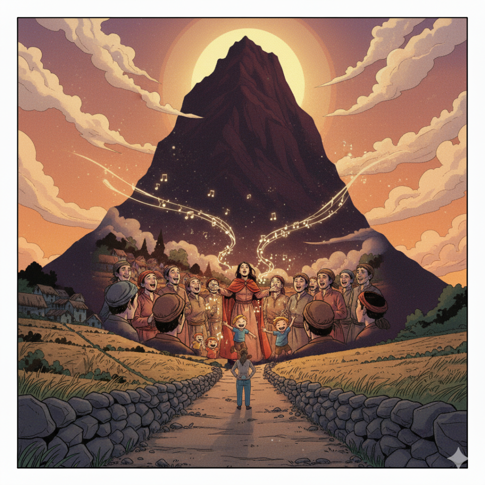 시간이 흘러도 사람들은 이 이야기를 잊지 않았어요. 산은 여전히 그 자리에 있었지만, 더 이상 두려운 존재가 아니었지요. 사람들은 알게 되었어요. 산보다 옮기기 힘든 것은 포기한 마음이라는 걸요. 루치아는 어느 날처럼 산 앞에 서서 노래했어요. 이번에는 마을 사람들이 함께 불렀답니다.