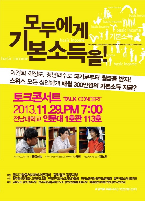 ○ 주최 : 광주알바연대(준), 교육공간 오름, 비정규직교수노조 전남대분회, 좌파노동자회 광주전남위원회, 한국기본소득네트워크