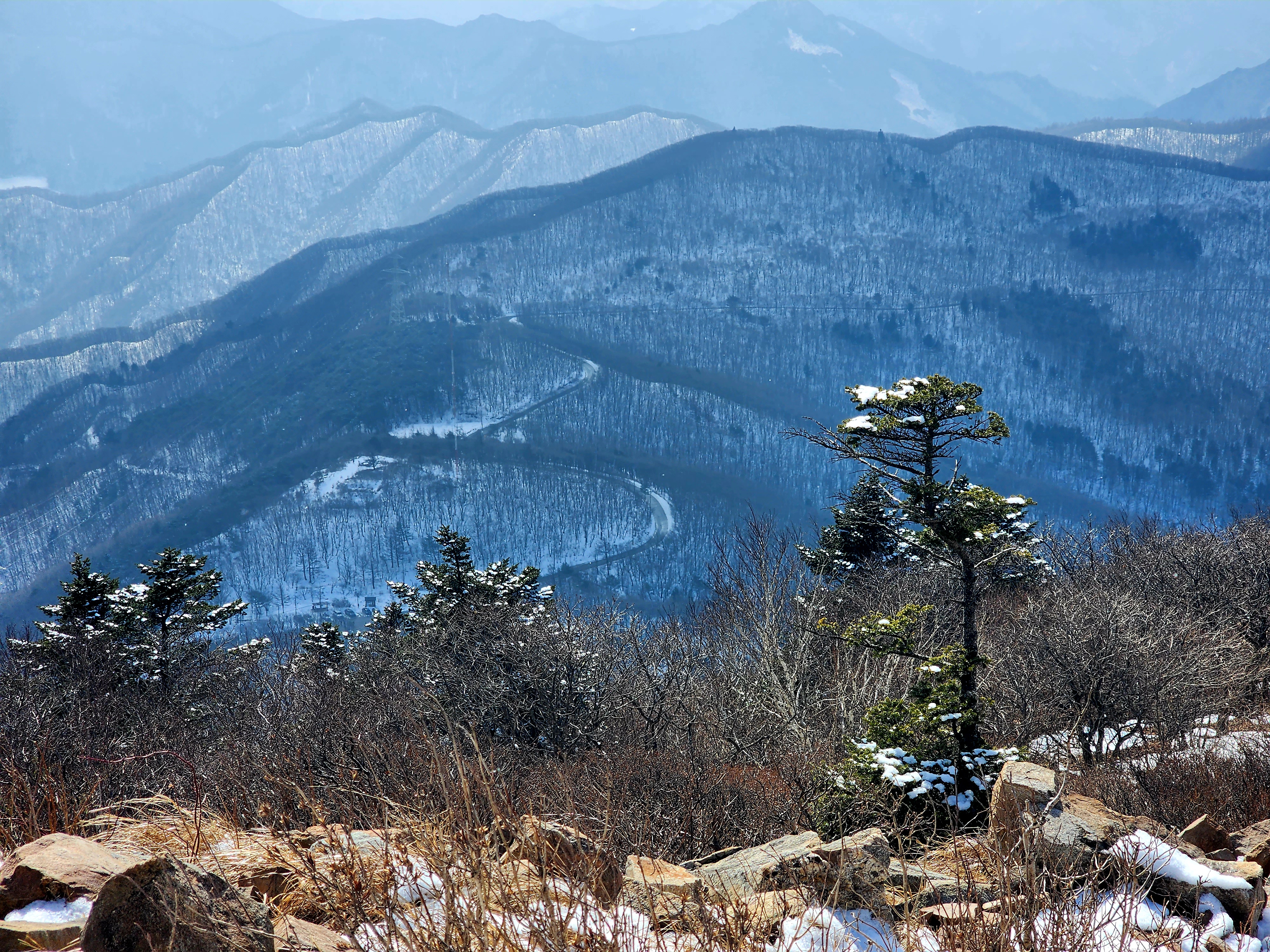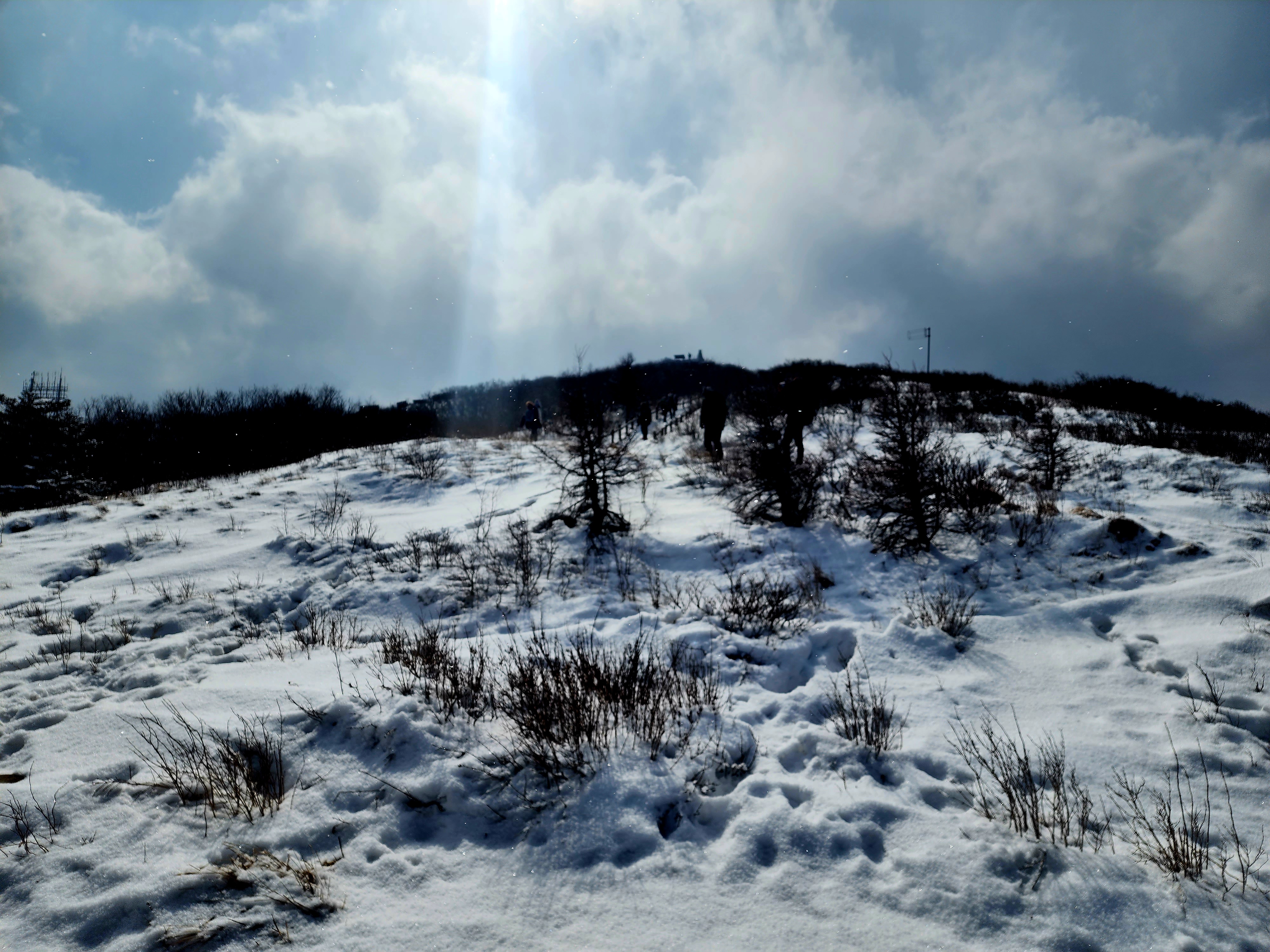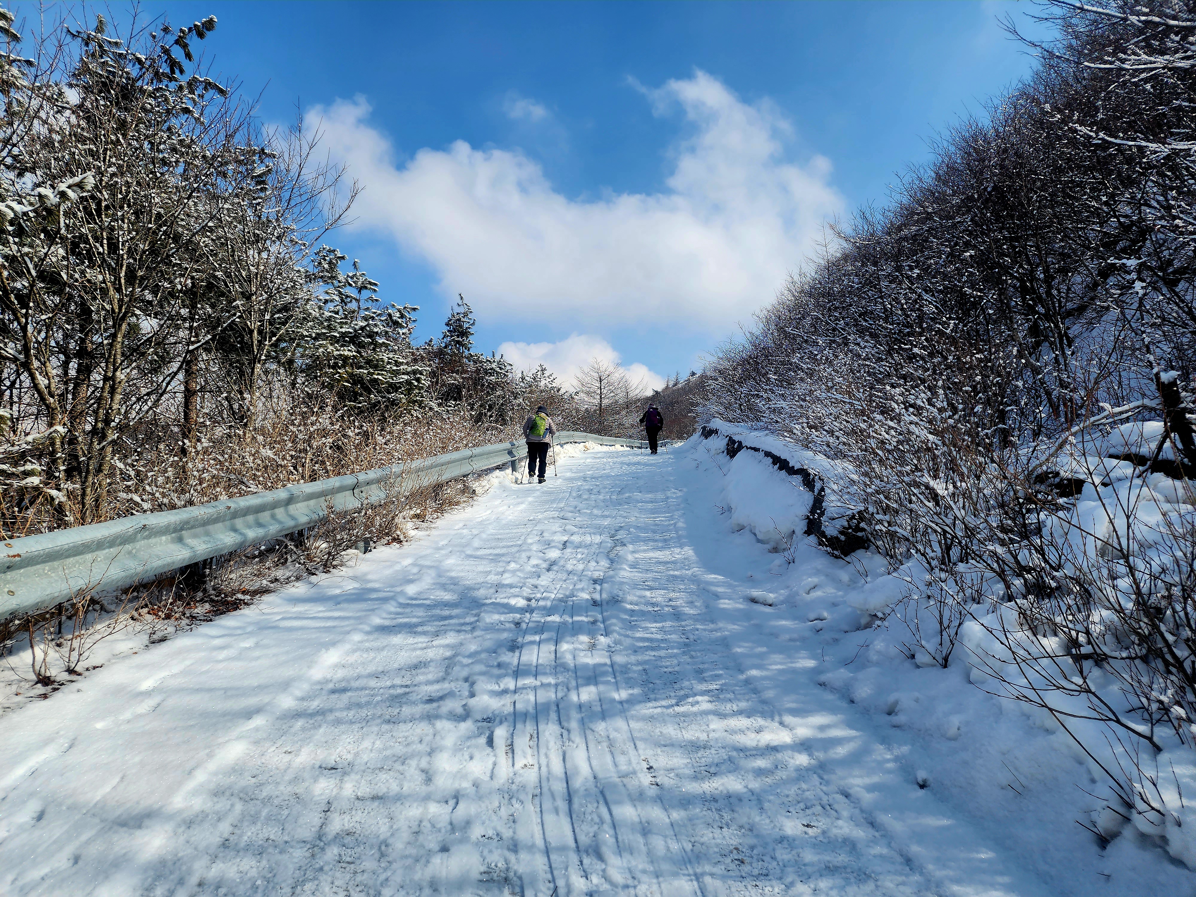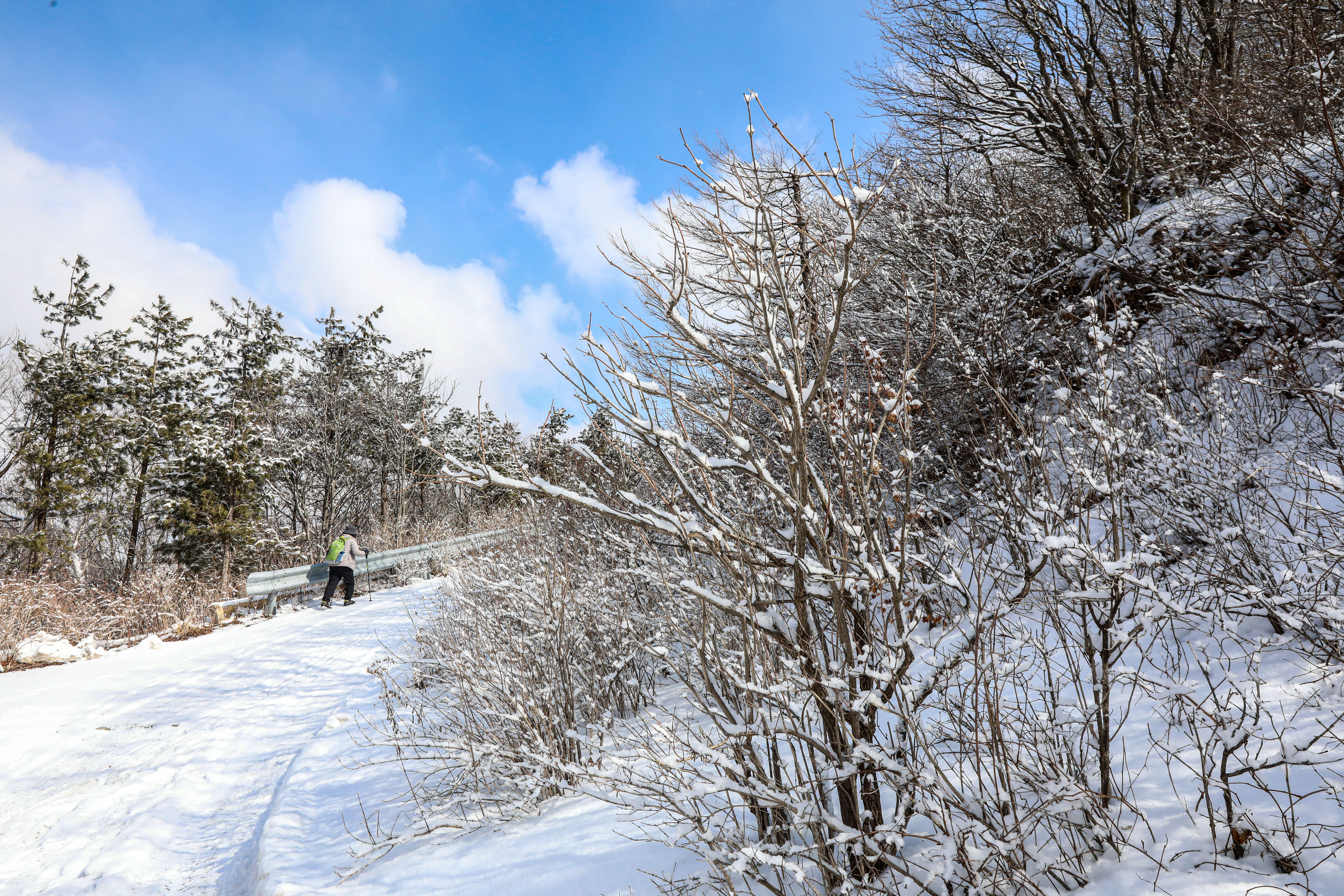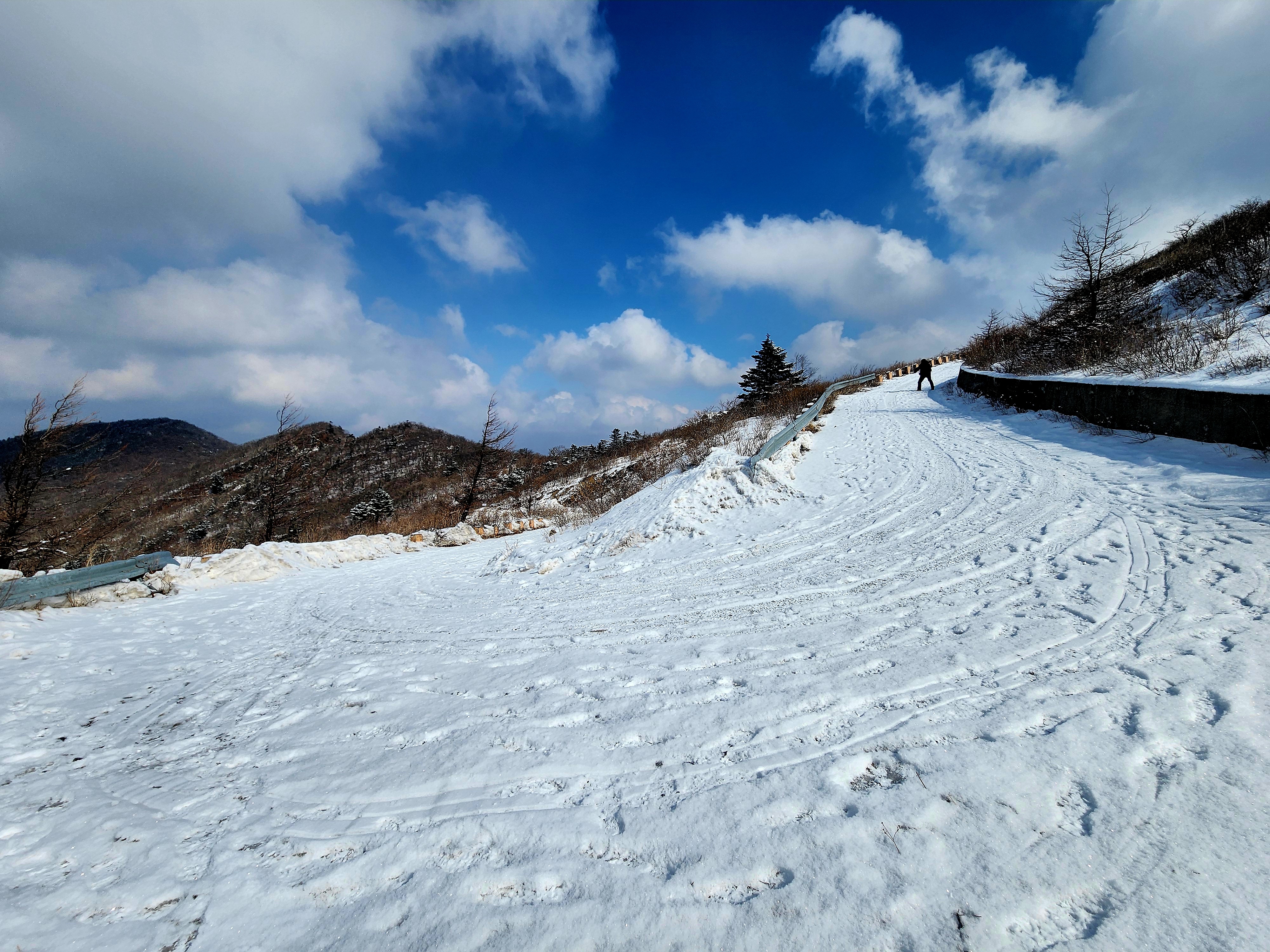 밤새도록 고갯마루에 걸린 구름 속의 수증기가 얼어붙어 나뭇가지마다 하얀 상고대를 피운 이곳에 눈까지 내리면 아름다운 순백으로 채색됩니다.