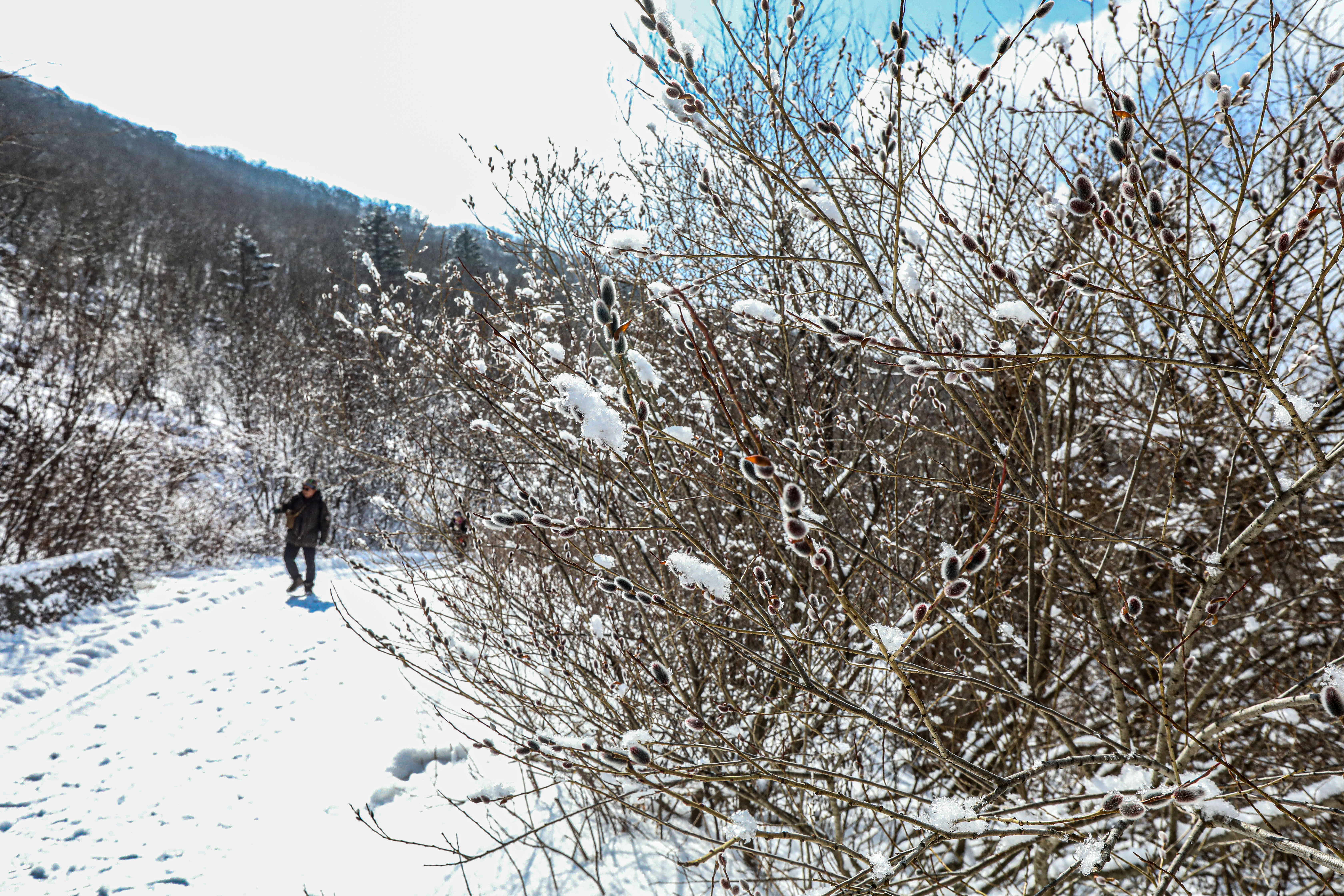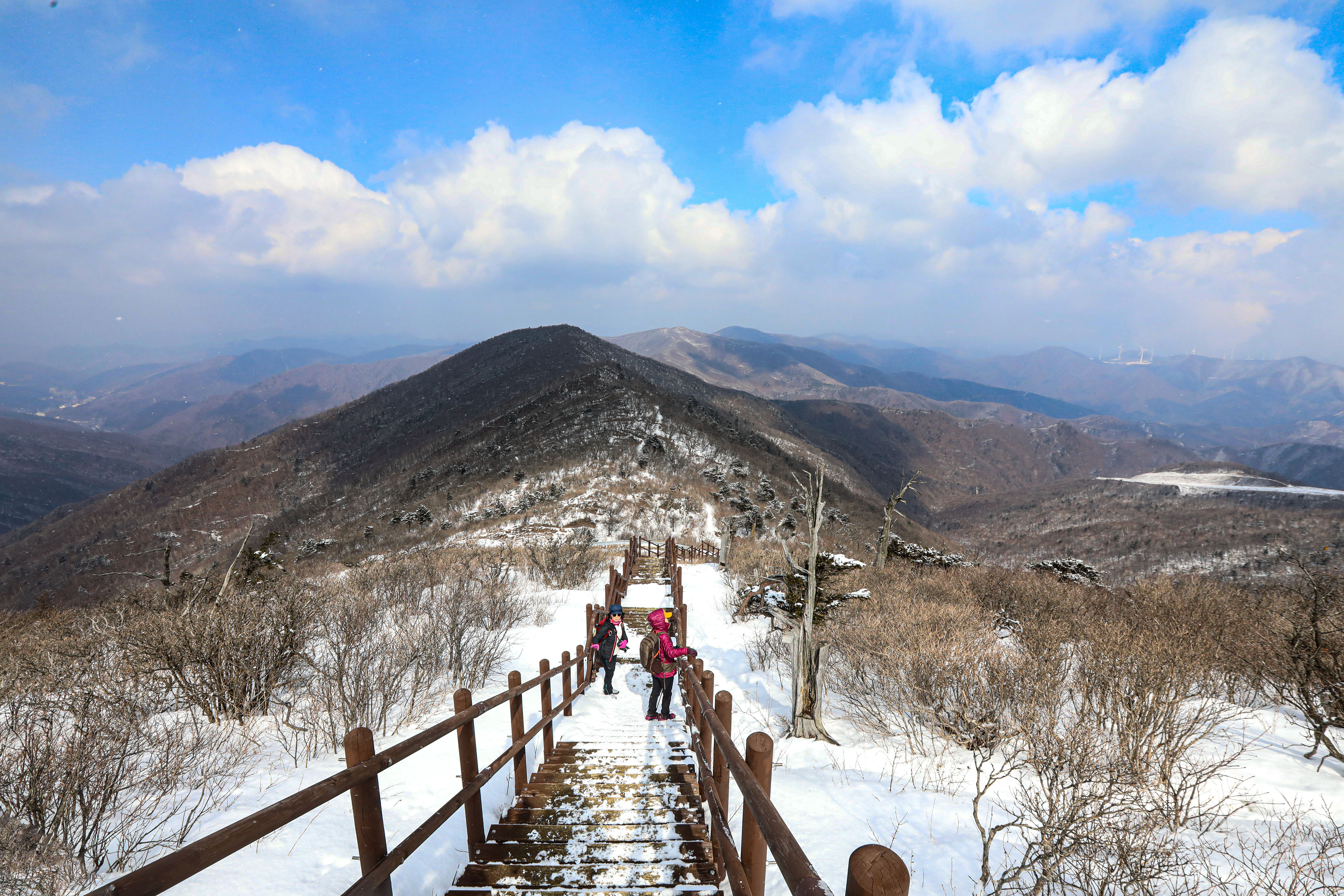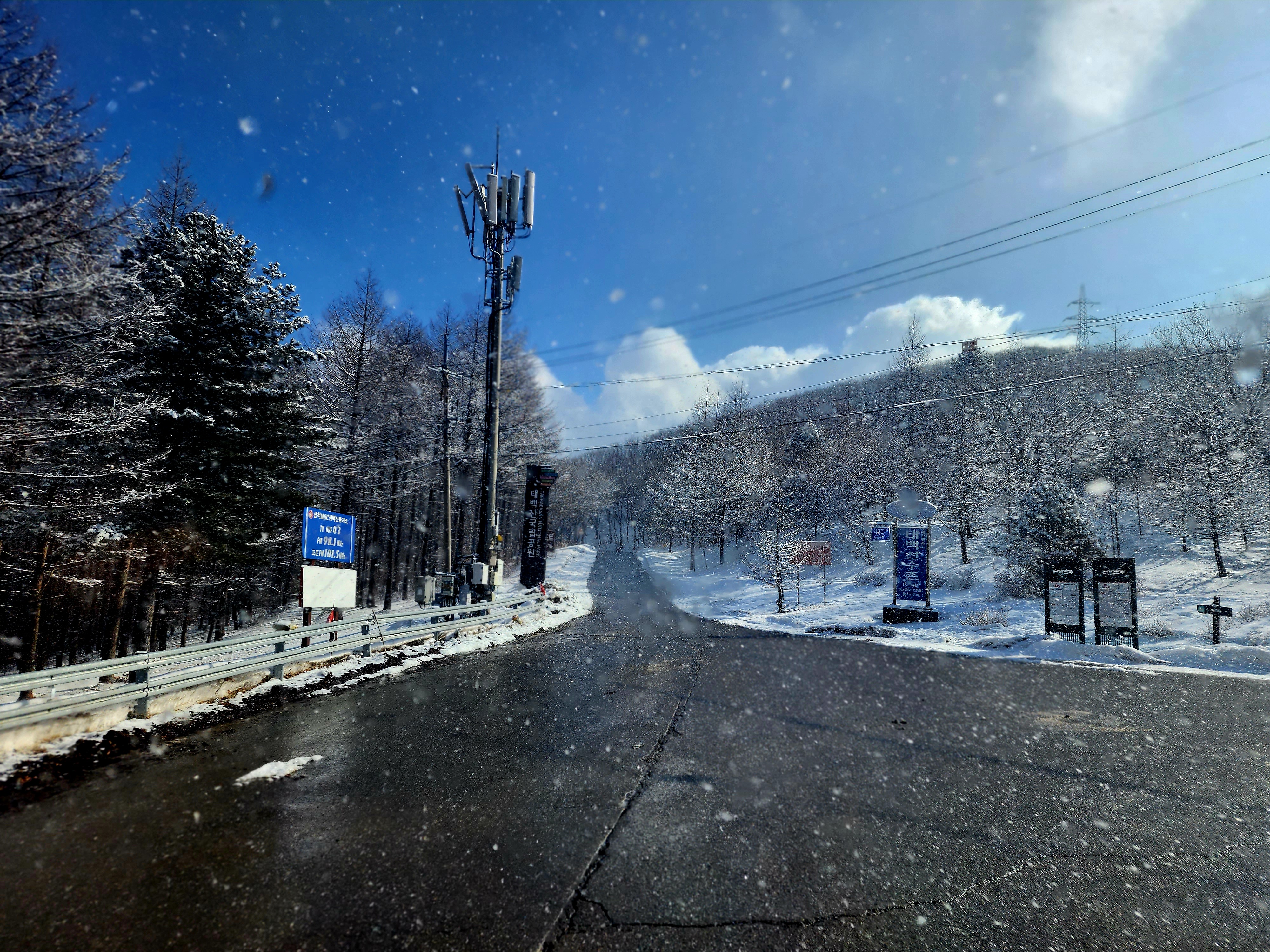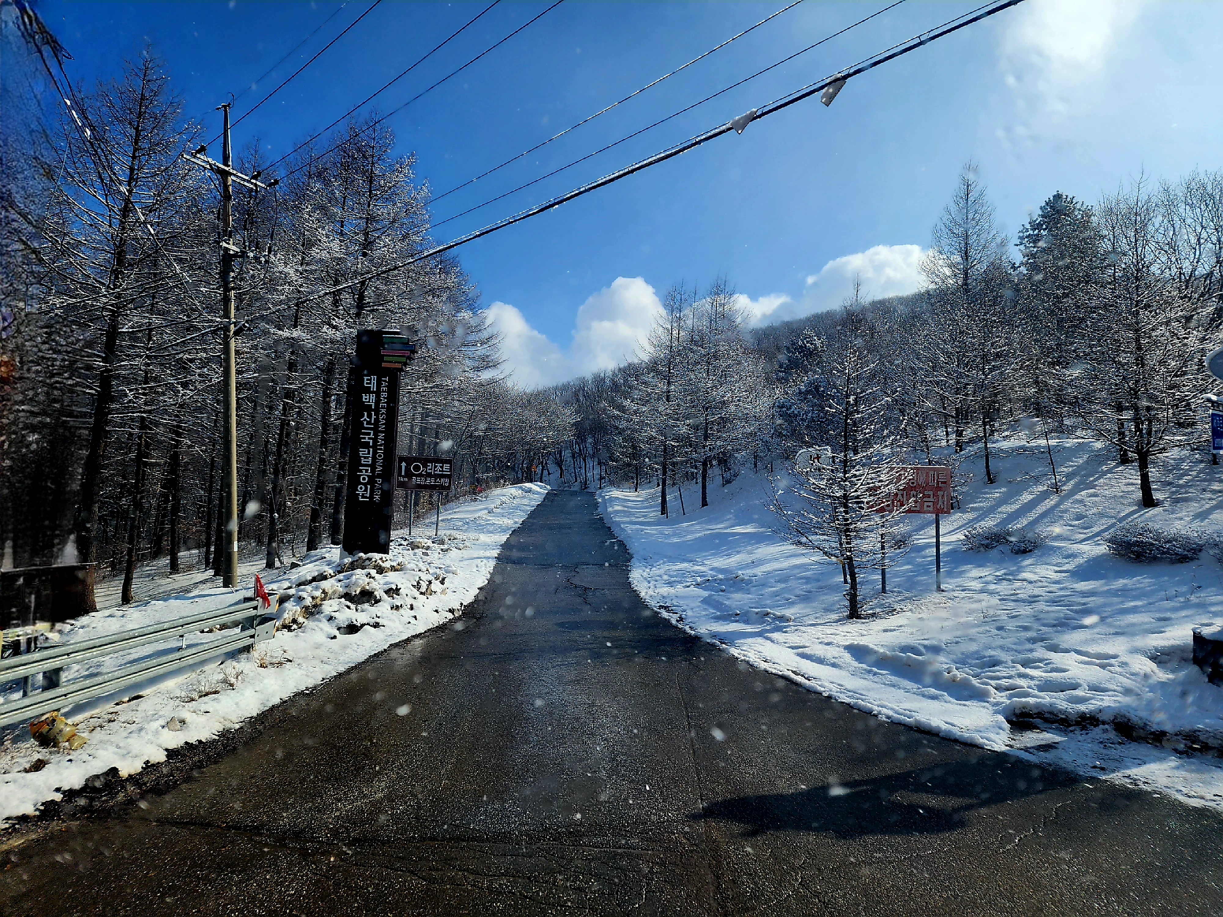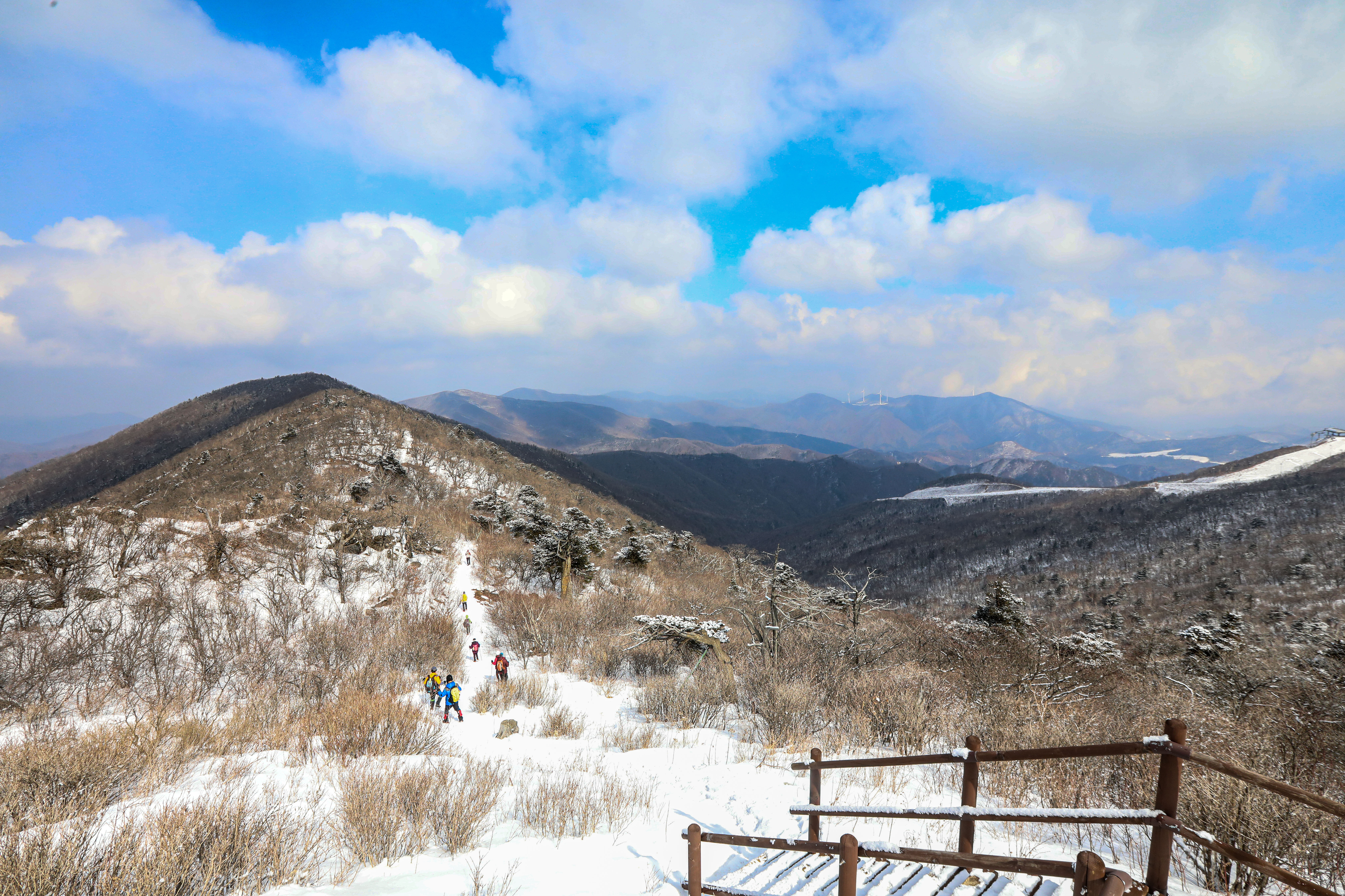 밤새도록 고갯마루에 걸린 구름 속의 수증기가 얼어붙어 나뭇가지마다 하얀 상고대를 피운 이곳에 눈까지 내리면 아름다운 순백으로 채색됩니다.