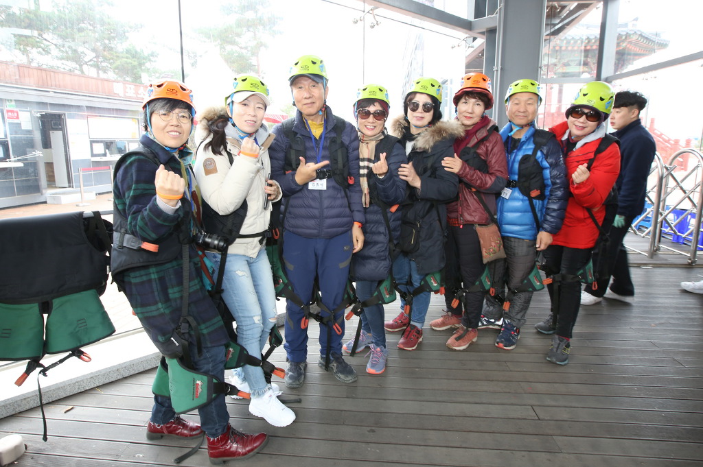 (사)한국여행사진작가협회 소속의 여행작가 사진작가들이 김천팸투어 중에 김천부항댐 관광단지내에 있는 짚와이어 체험전에 기념촬영을 하고 있다.