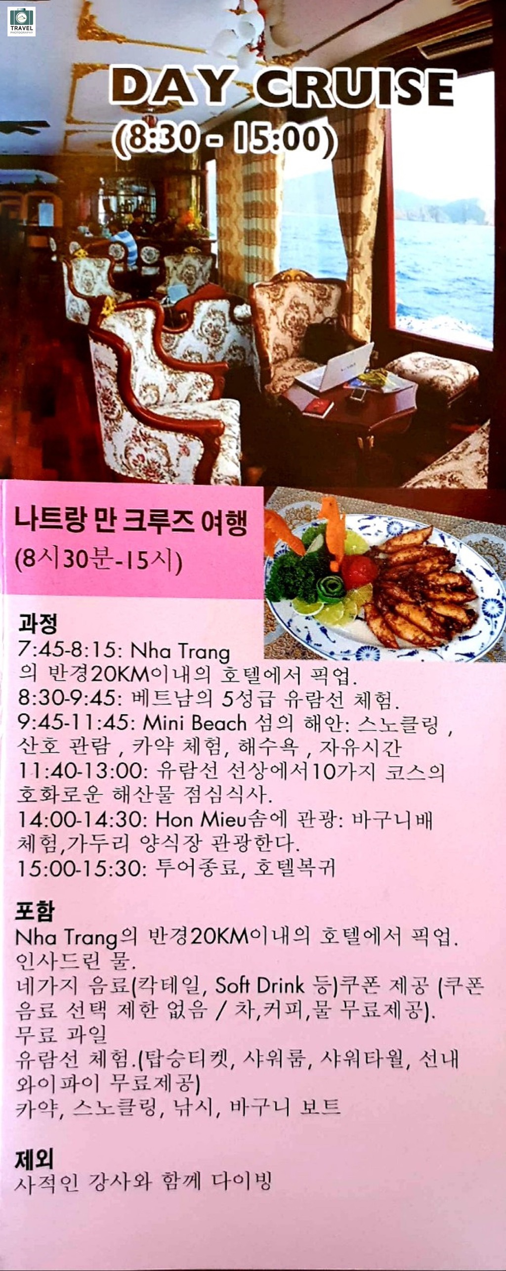 08:00~08:45 호텔 앞 셔틀버스 탑승 → 항구 도착 & 크루즈 탑승 → Mieu 섬 → San Beach 스노클링 → Hon Tre 섬 정박 & 점심 식사 → Dam Bay Lagoon 휴식 & 수영, 선텐, 카약킹 등 → Vung Ngan 현지 어촌 마을 방문 → 15:30~16:00 투어 종료 & 호텔 샌딩