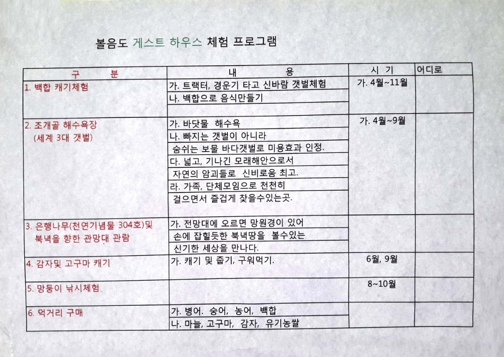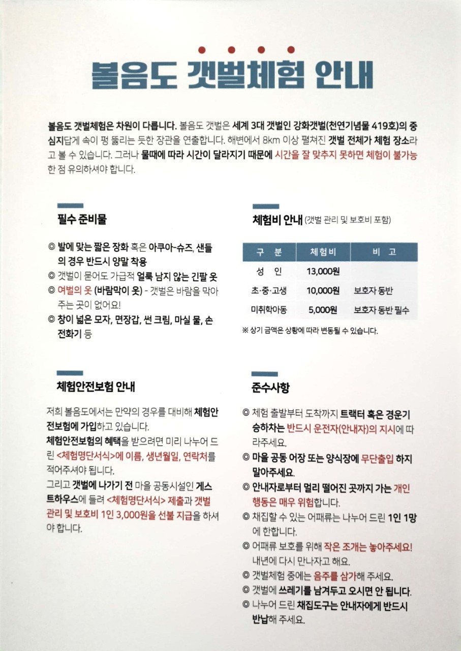 - 볼음도행 배 시간 : 09:30, 15:00 총 2회(여름 성수기 왕복 3번 운행)
