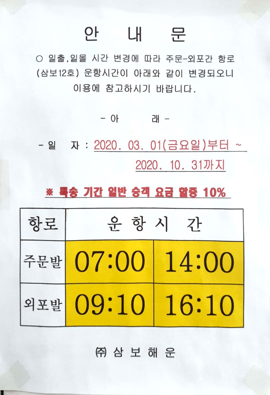 - 외포리 구 선착장행 배 시간 : 07:00, 12:40 총 2회(여름 성수기 왕복 3번 운행)