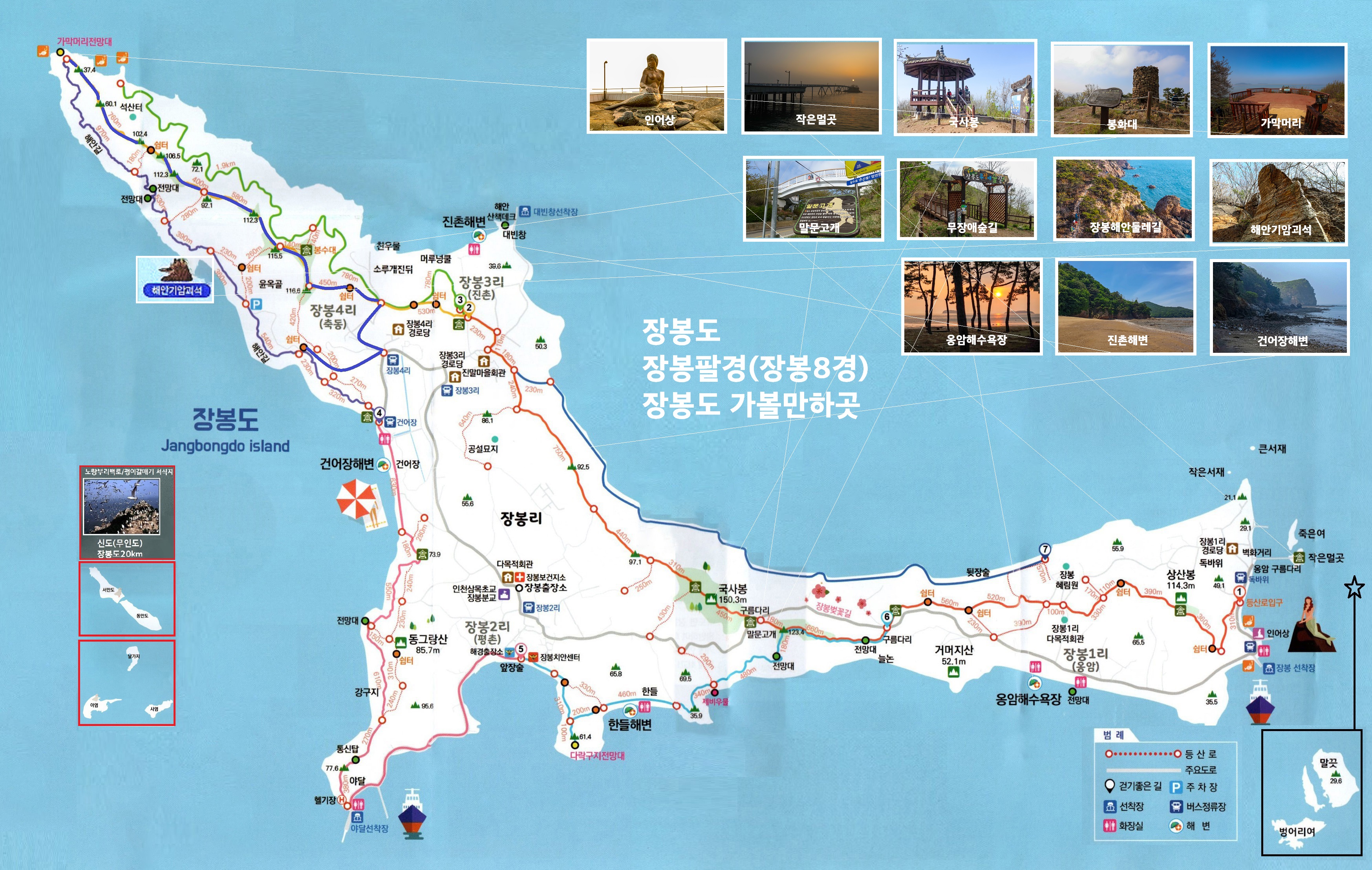 장봉도(長三島)는 섬이 길고 봉우리가 많아 부르게 된 지명으로, 섬은 북쪽을 향하여 느리게 만곡을 이루며, 해안 곳곳에 암석 감각(岬角)이 돌출한데나 해식애(海蝕崖)가 발달하여 절경을 이룬다.