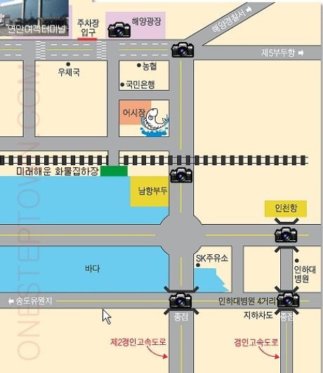 인천항 사거리 (좌회전) → 구)백주년기념탑(우회전) → 해양경찰청 → 인천 연안부두 여객터미널사거리(좌회전)