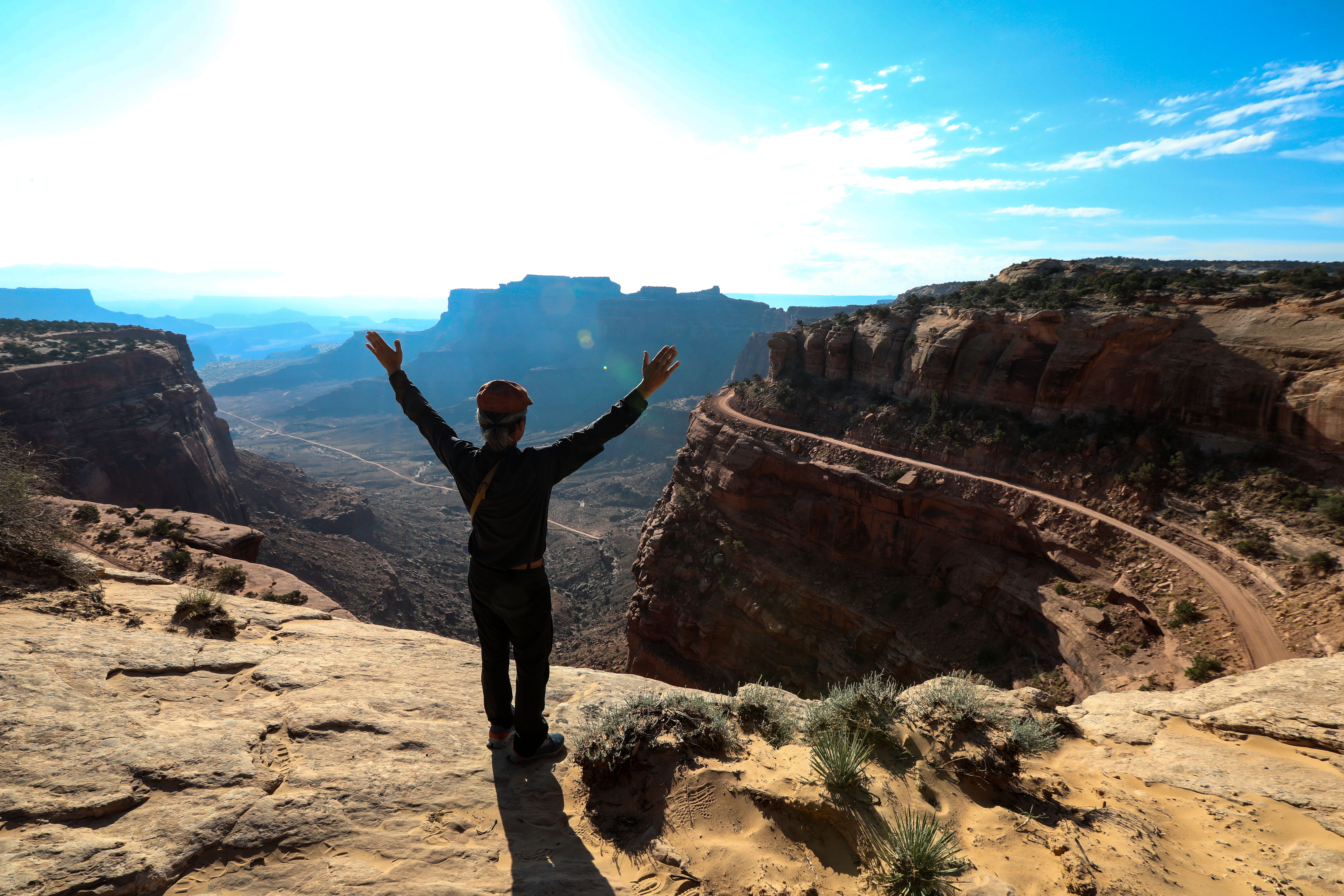 콜로라도 강 , 그린 강 및 각각의 지류에 의해 수많은 협곡과 암석으로 침식된 다채로운 풍경을 보여주는 모든 캐년의 어머니 격인 캐년 랜드의 하층부와 상층부를 연결하는 비포장 도로
