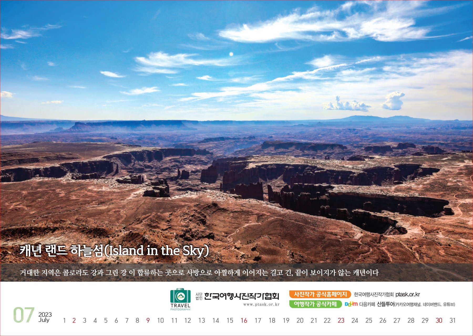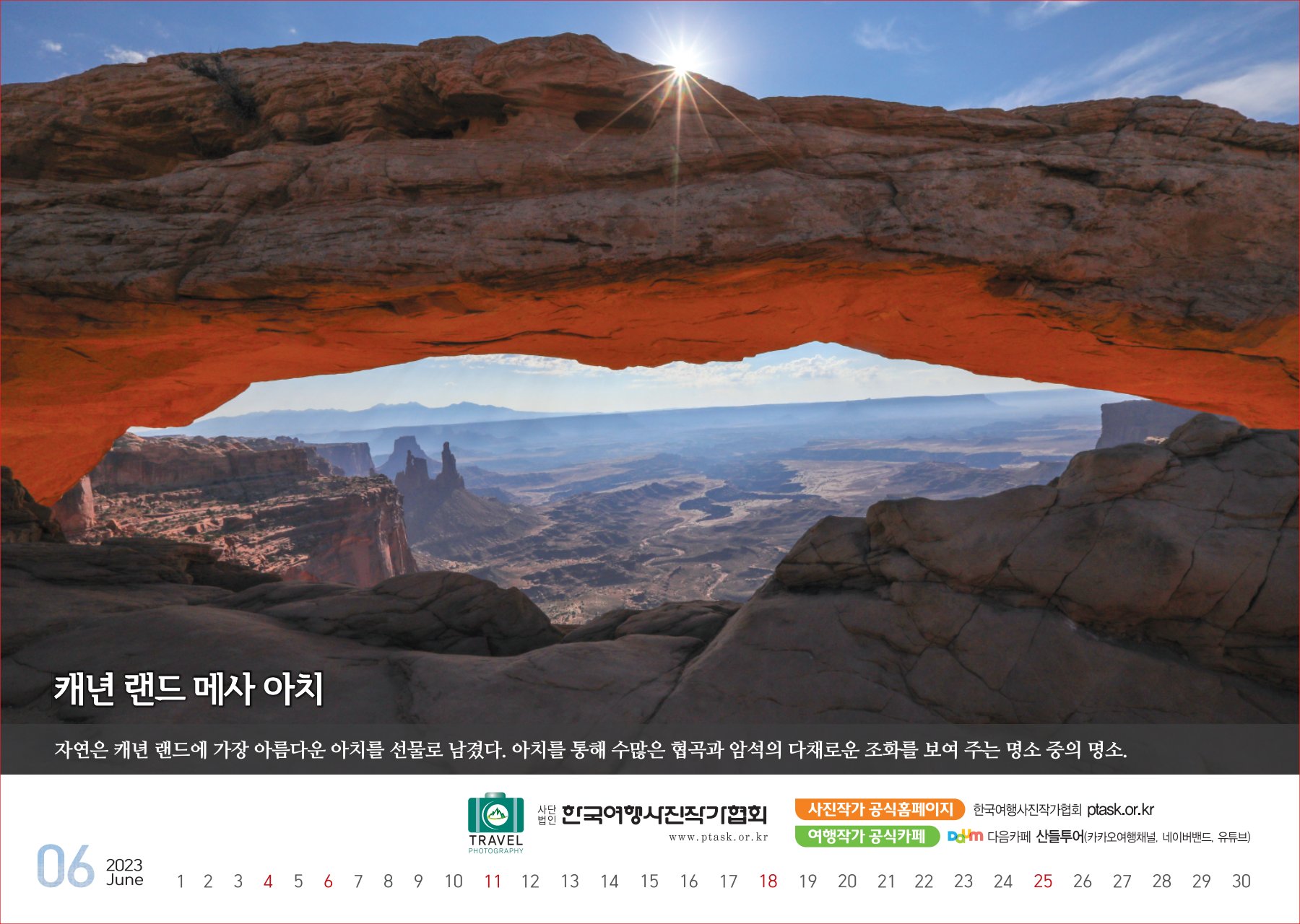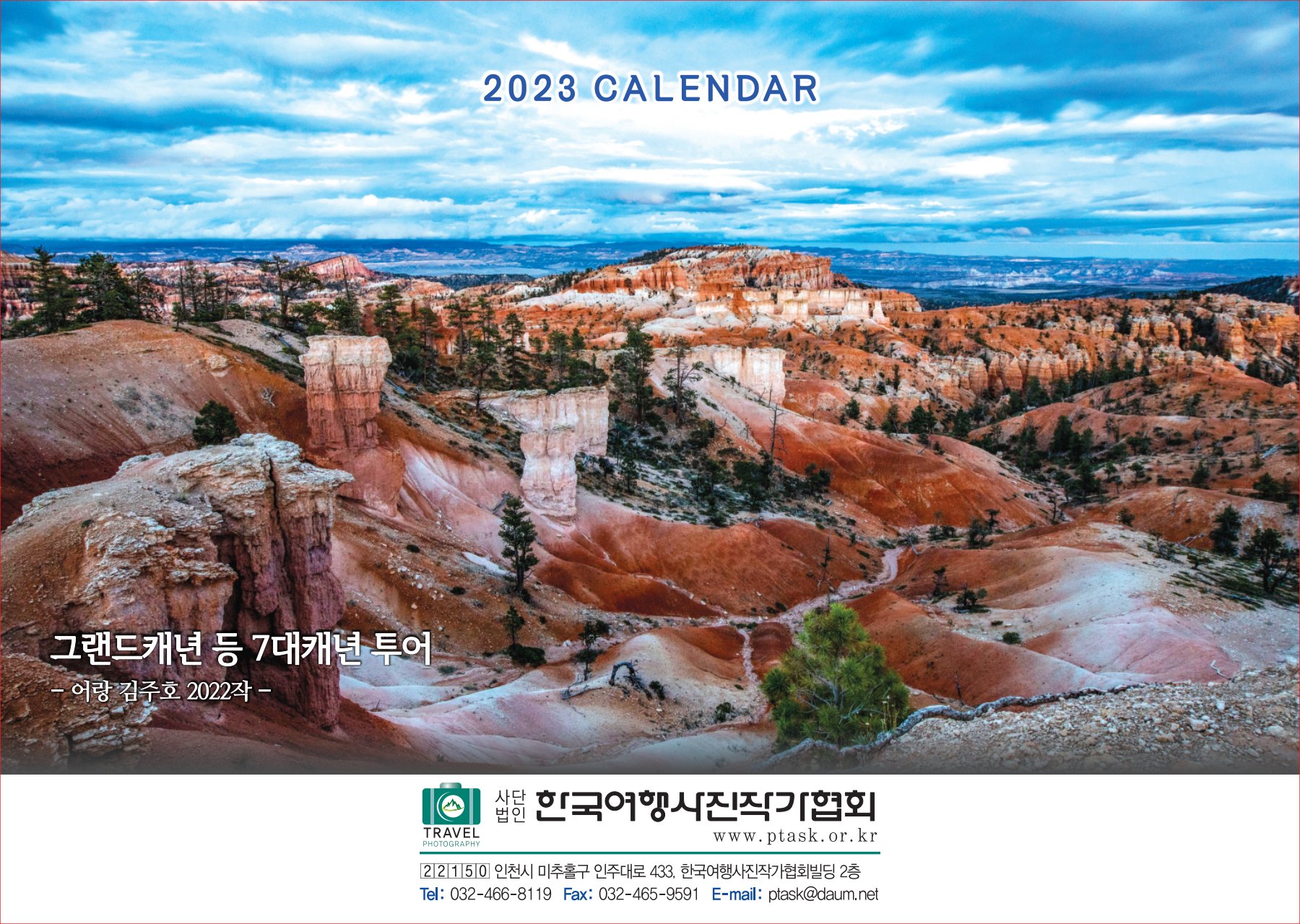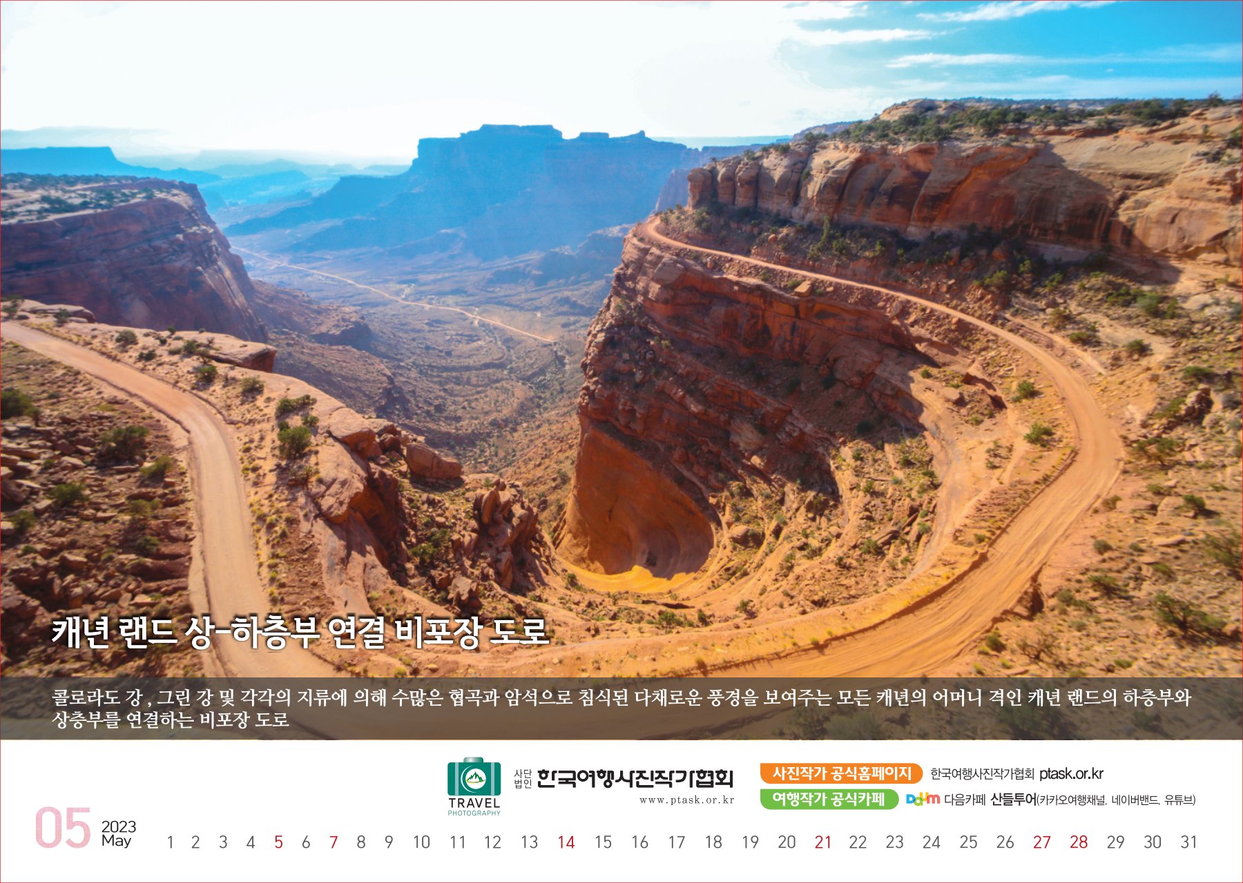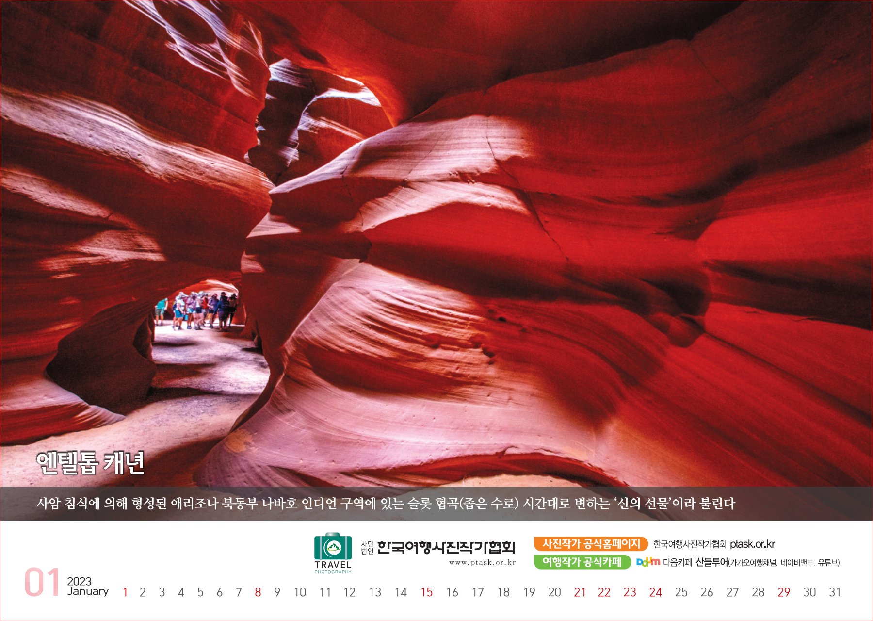 [한국아트뉴스=어랑] 한국여행사진작가협회에서 운영하는 산들투어 (대표 김주호)가 2023년 계묘년(癸卯年) 새해 ‘그랜드캐년 등 7대캐년’을 수록한 탁상용 달력 500개를 내달 2일부터 배부한다.