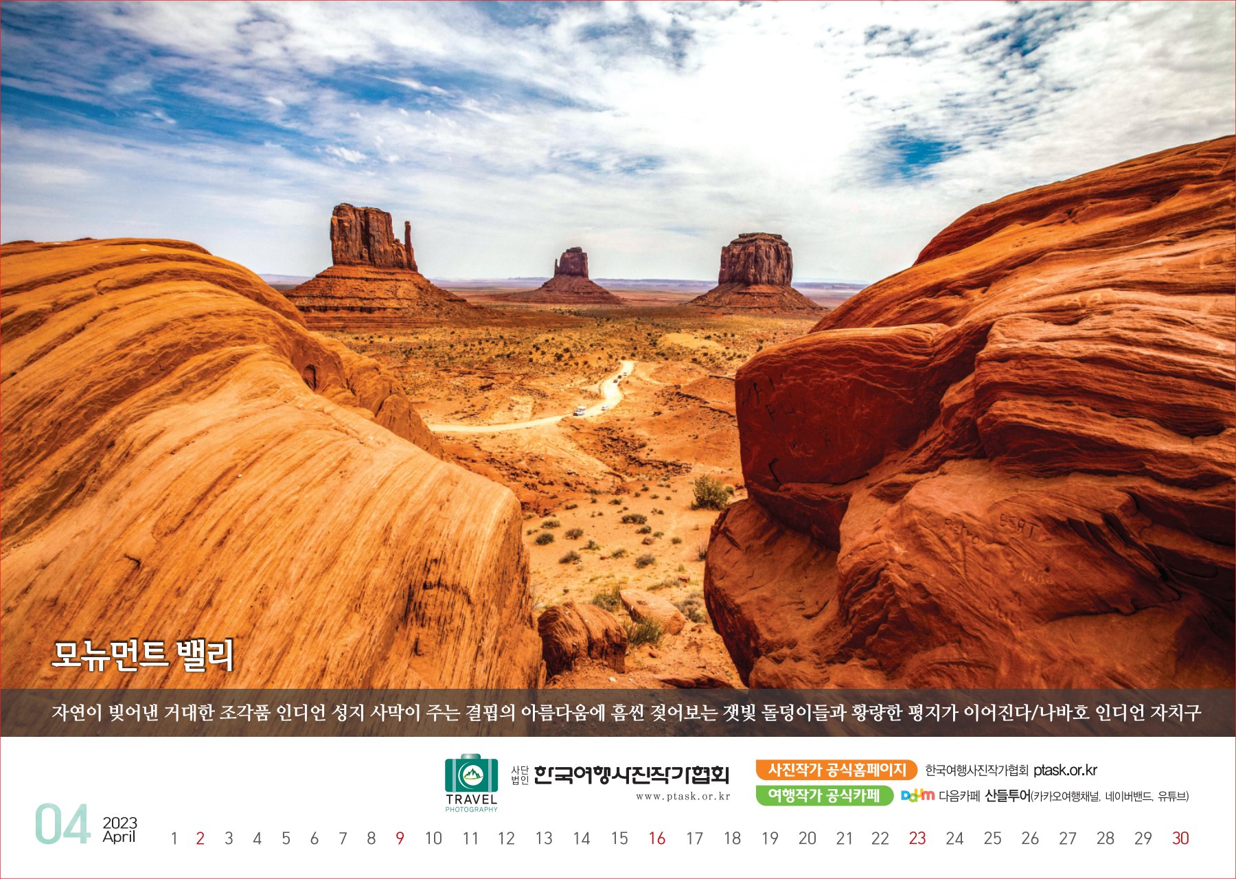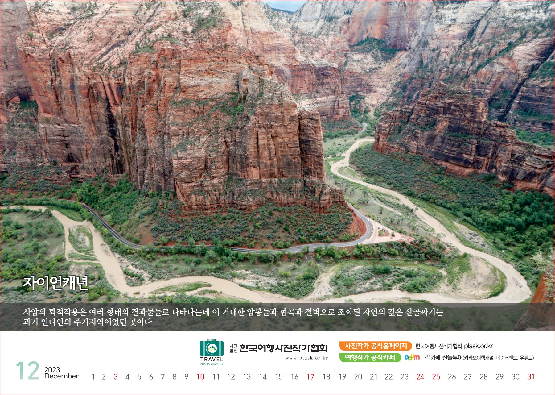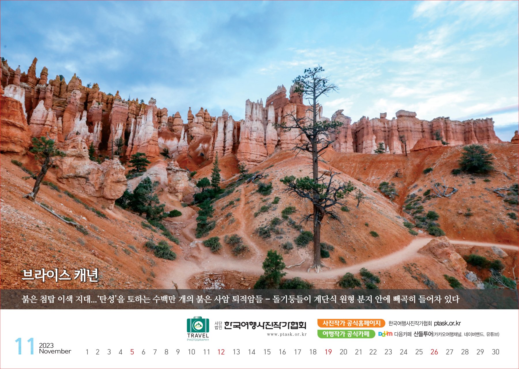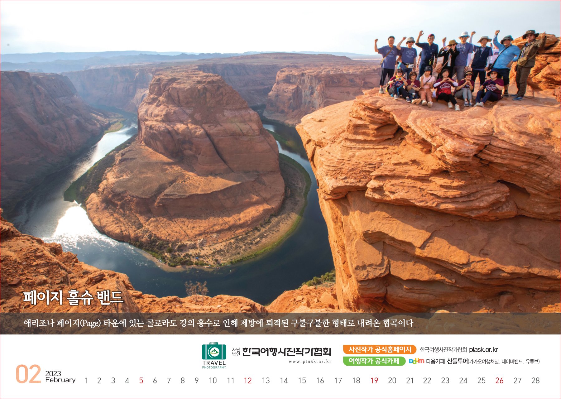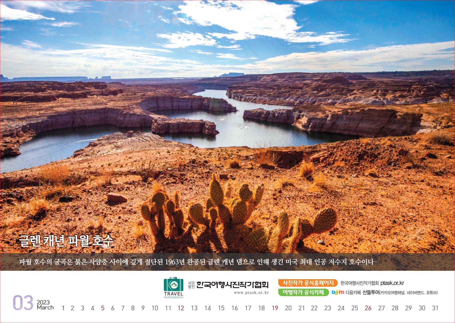 [한국아트뉴스=어랑] 한국여행사진작가협회에서 운영하는 산들투어 (대표 김주호)가 2023년 계묘년(癸卯年) 새해 ‘그랜드캐년 등 7대캐년’을 수록한 탁상용 달력 500개를 내달 2일부터 배부한다.