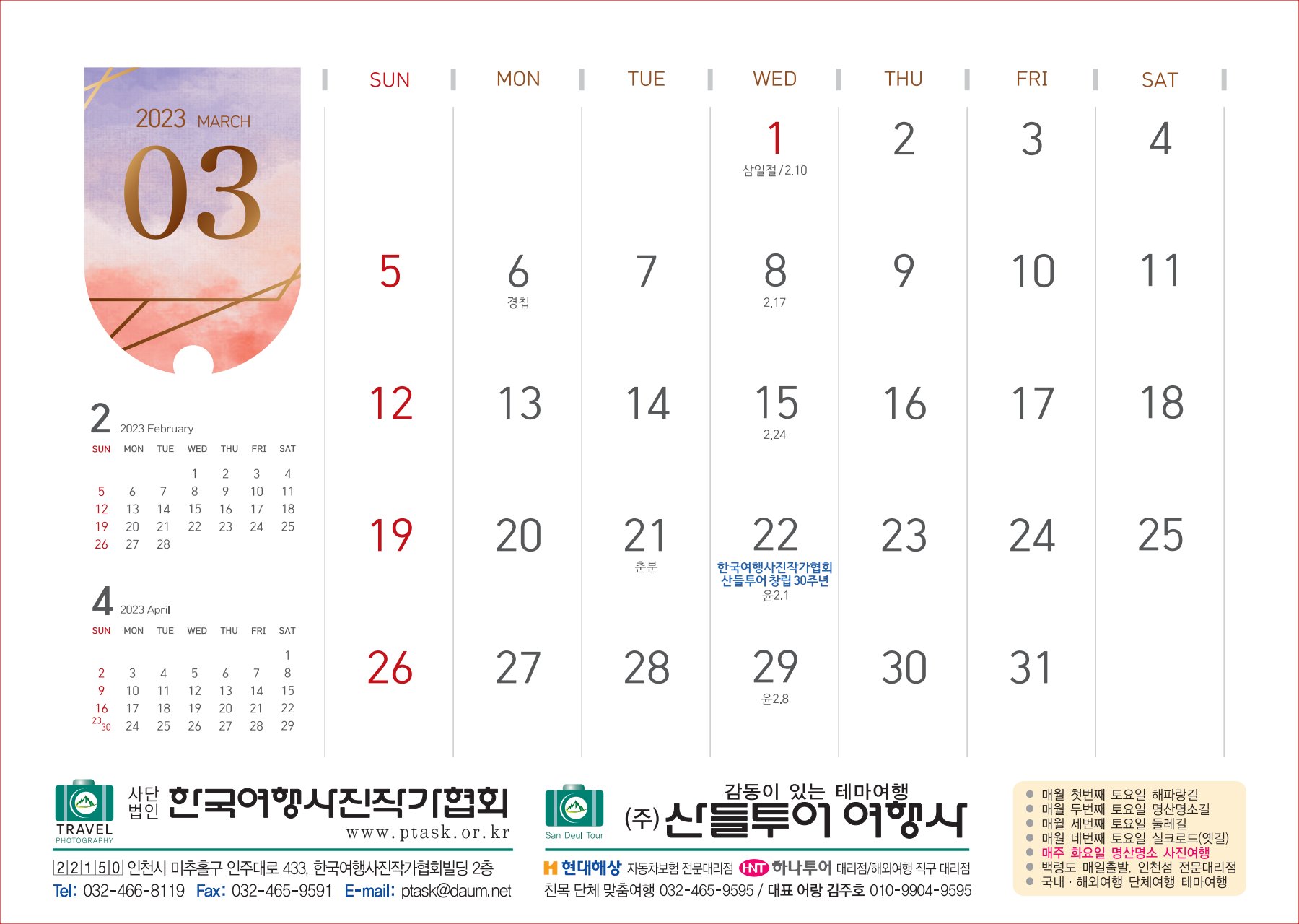 달력을 받길 원하는 사람은 인천시 미추홀구 인주대로 433 한국여행사진작가협회빌딩2층 산들투어 "다음카페 '산들투어' 한국아트뉴스 게시판 신청서를 작성"하고 행사에 참석하거나 산들투어를 방문하면 된다. 달력은 1인 1개에 한해 선착순으로 무료 배부한다.