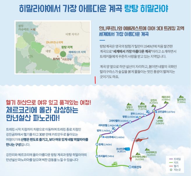 전문가의 말에 의하면 "랑탕 지역은 카트만두와 가깝지만 트레킹 시작점까지 장시간 차량 이동을 하고 설산이 가깝게 보이는 곳까지 도달하기 위해 첫째, 둘째 날 많은 고도를 올려야 한다"며 "힘든 산행 이후, 일정 고산 지대에 도착한 후에는 능선 트레킹을 즐길 수 있다는 장점이 있다"고 말했다.