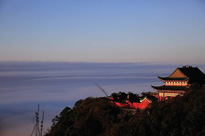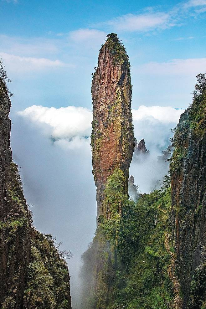 동천문을 통과하자 거짓말처럼 날씨가 개이면서 온갖 기암 봉우리들이 운해 위로 그 모습을 드러냈다. 첩첩이 쌓인 산들의 파노라마는 지평선 가득 펼쳐진다. 어느 산 하나도 황량하지 않고 짙은 녹음이 드리워져 있다. 조금씩 붉게 물드는 단풍도 간간이 보인다. 전체 면적 6,000ha에 산림률 99.5%라는 망산의 명성을 확인한 순간이었다. 가이드는 “망산은 1㎤당 10만 개가 넘는 음이온이 뿜어져 나와 삼림욕하기 좋다”고 설명했다.