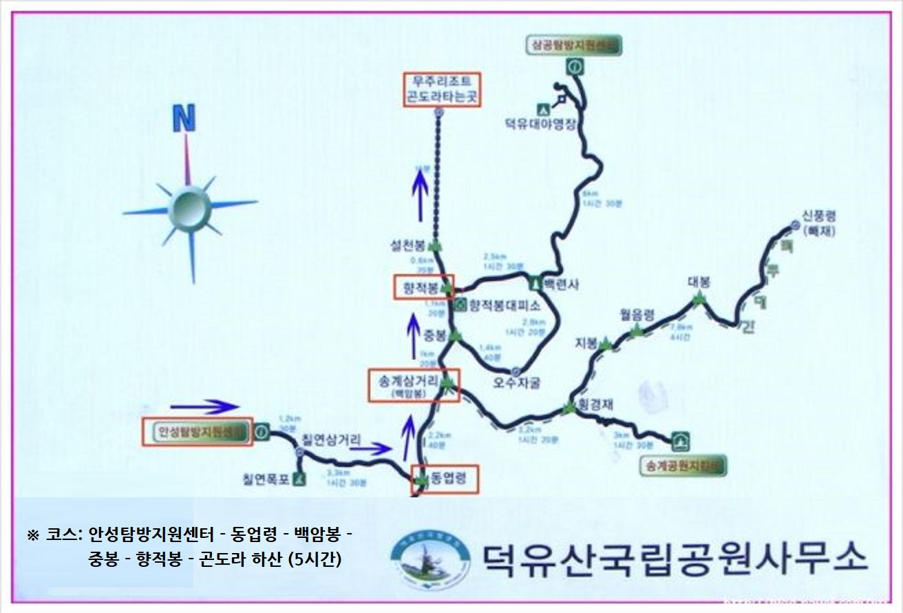 ※ 산행코스: 안성센터 - 동업령 - 백암봉 - 중봉 - 향적봉 – 곤도라 하산 (5시간)