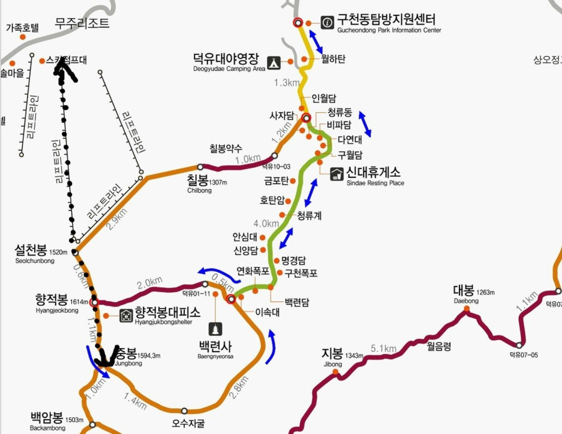 종주코스 : 주차장-곤도라타고-향적봉-중봉-백련사-향적봉-곤도라-주차장(9km/4시간)