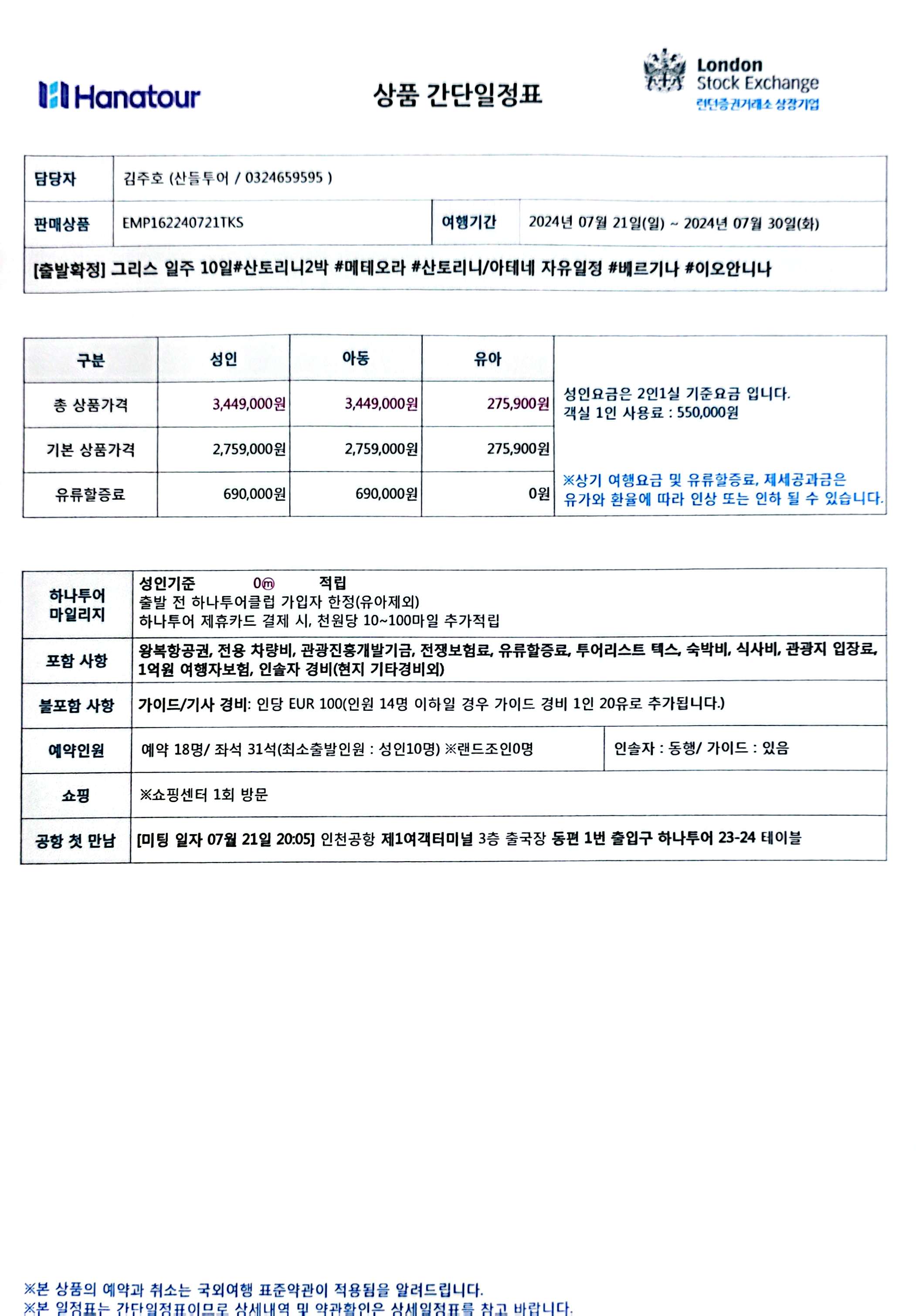 장소 : 인천공항 제1여객터미널 3층 출국장 동편 1번 출입구 하나투어 23-24 테이블