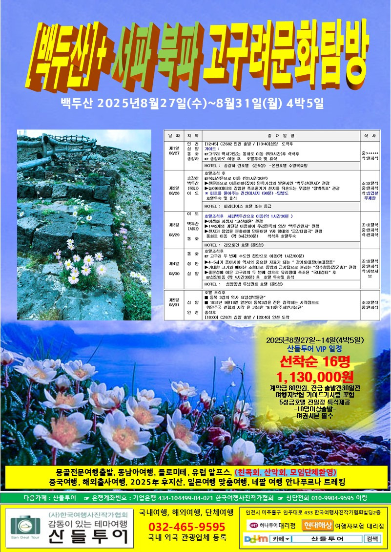 8월27일(수) 백두산(심양-북파-서파-집안/고구려유적지) 4박5일 야생화여행