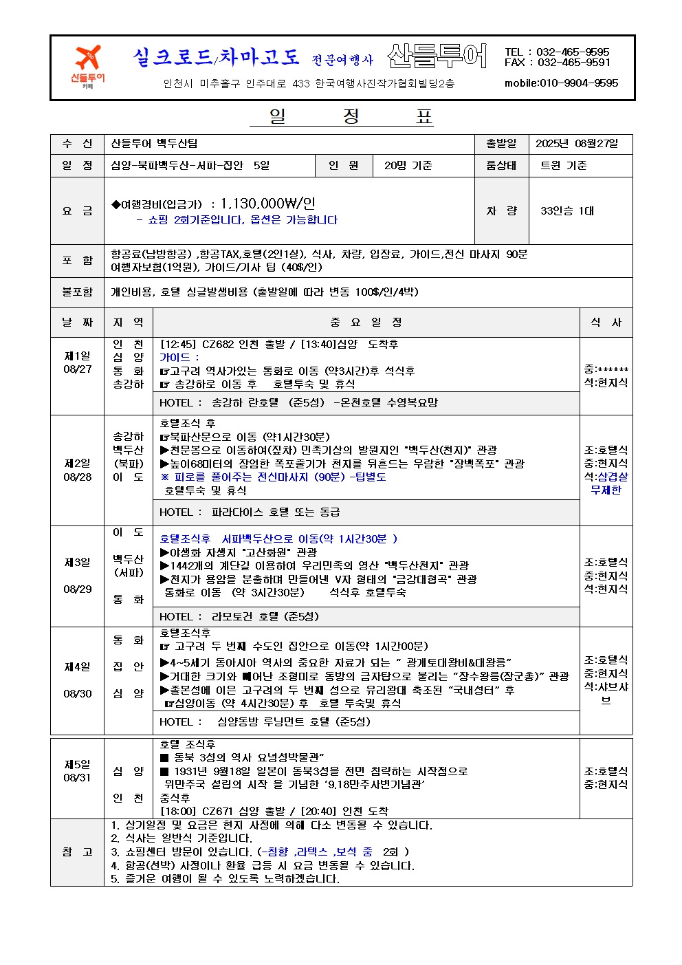 참가문의 및 신청과 일정표 등 자세한 자료는 산들투어 여행사(주) 032-465-9595 문의하시길 바랍니다.