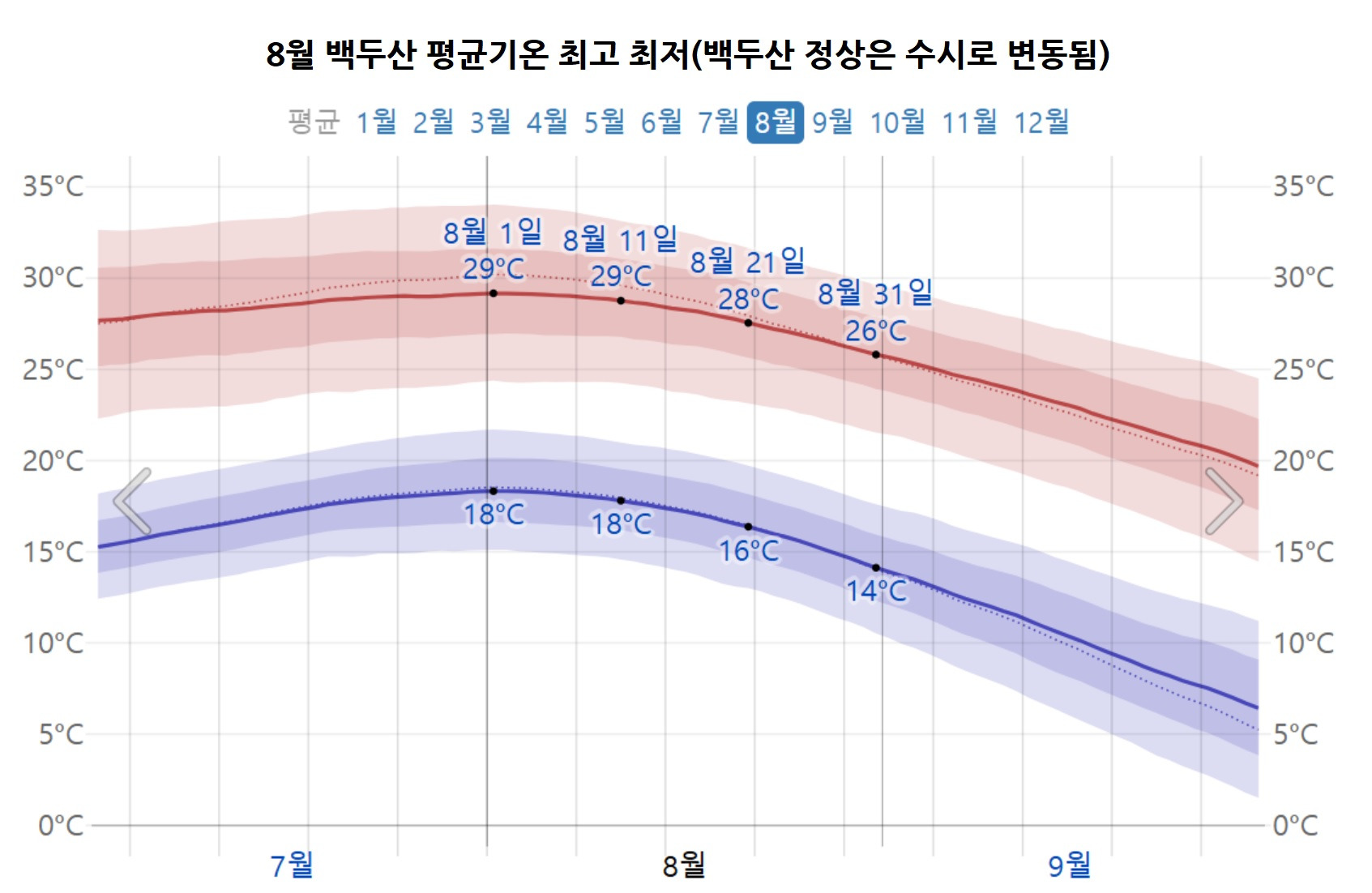 8월 백두산의 기온은, 최저 14도, 최고 29도이며, 산 입구와 산 정상의 기온차가 매우 크기 때문에, 시기적절한 옷차림이 필수입니다.