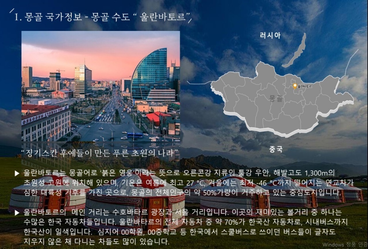 다채로운 자연 경관을 품은 국가, 몽골. 흔히 유목민의 국가로도 잘 알려진 곳이다. 그 명성에 걸맞게 몽골 도심에서 조금만 벗어나면 드넓은 초원이 눈앞에 펼쳐진다.