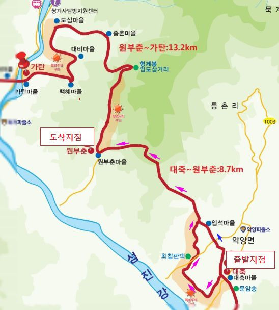 홈페이지 자료에는 대축마을 – 입석마을(2.2km) – 윗재(2.7km) – 원부춘마을(3.6km)