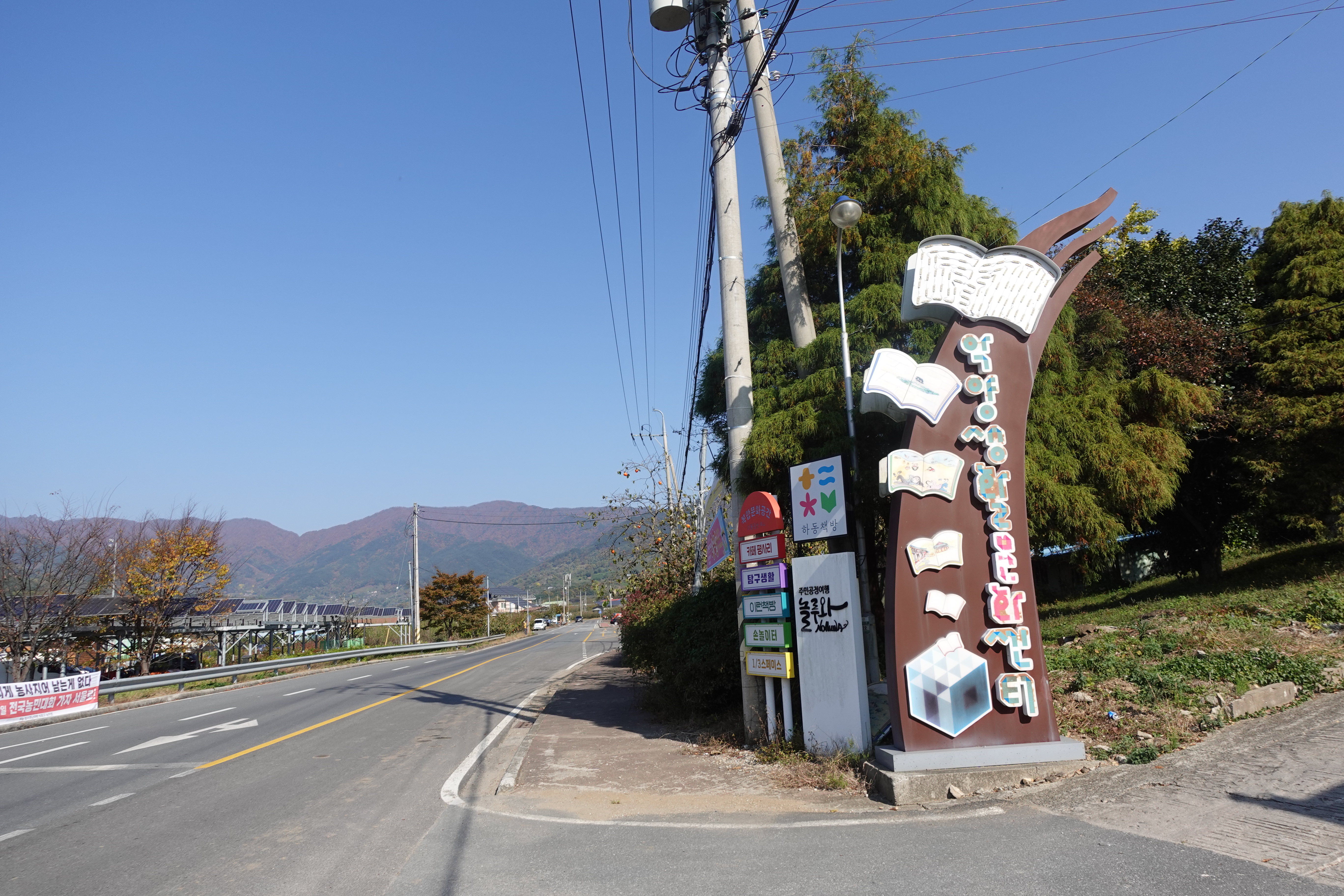 평사리 들판을 거쳐 가는 길과 강둑길을 걷는 길로 나눠지는 입석마을 입구를 도착하니 벅스가 나오고 이곳부터 지리산둘레길에 들어선다