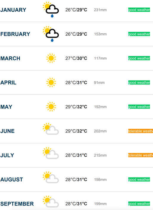모알보알 날씨는 정확하게 예측할 수 는 없지만 전반적으로 화창하나 6월 7월 10월에는 앞바다에 파도가 잦은 경우가 있고, 간혹 호핑이 취소되는 경우도 있습니다