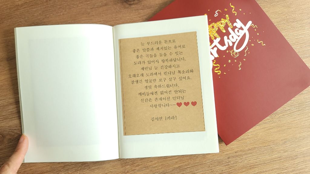 톡으로 주셨던 생일 메세지들은 카드사이즈와 같은 예쁜 노트에 프린트해 붙여 드렸어요