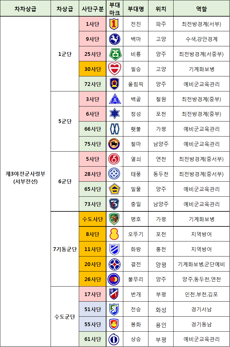 우리나라 서부전선을 책임지는 제3야전군사령부 산하에는 제1군단, 제5군단, 제6군단, 제7군단, 수도군단 등으로