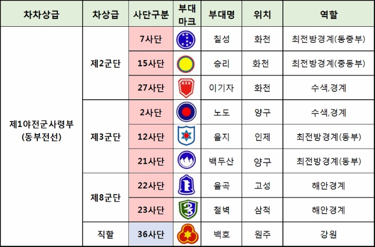 우리나라 동부전선을 책임지는 제1야전군사령부 산하에는 제2군단, 제3군단, 제8군단, 직할부대로