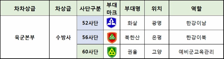 우리나라 수도방위를 책임지는 수도방위사령부 산하에는 52사단(화살부대) , 56사단(북한산부대) , 60사단(권율부대) 등이