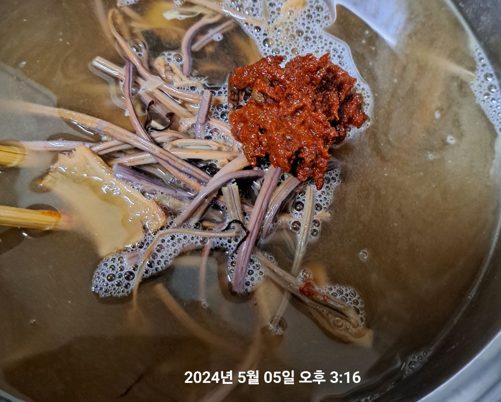 생고기는 된장 푼 물 팔팔 끓을 때 넣고