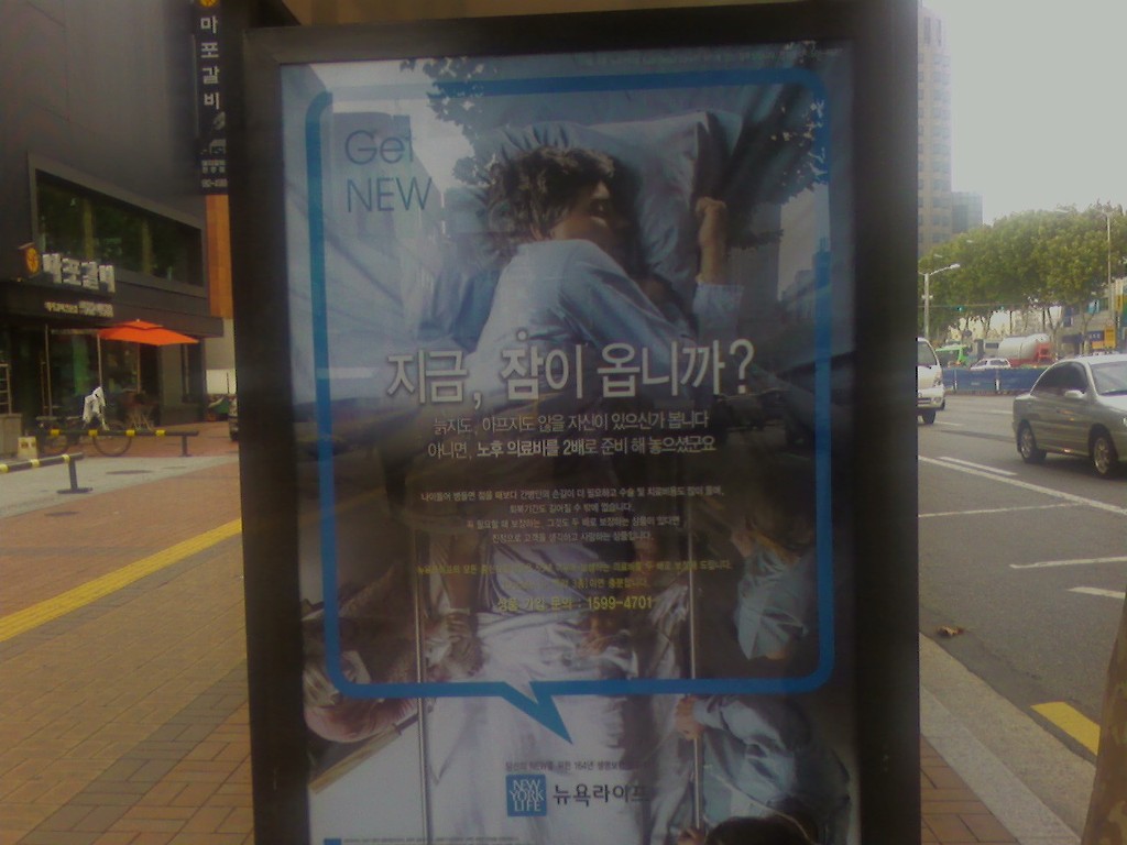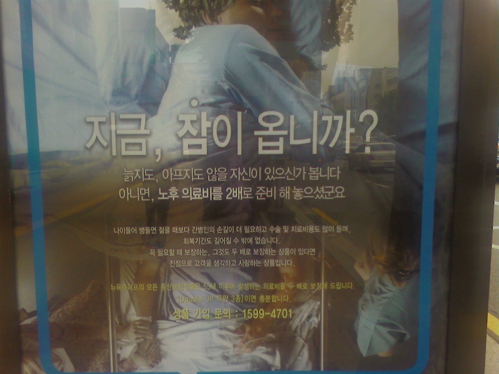 강남역 부근에서 본 이 보험광고는 이제 더 이상 협박으로서의 성격을 숨기지도 않는다. 짧은 노동 연한과 보장되지 않은 노후라는 현실 앞에서 그렇지 않아도 불안해 하는 우리들에게 이 광고는, 피곤한 야근과 회식을 마치고 귀가해 다음날 일찍 다시 출근할 때까지 누리는 그 짧은 "잠" 마져도 우리에게 그냥 주어지는 것이 아니라고 상기시킨다. 그 잠은 이 보험상품을 구매함으로써 현실이 제공하지 않는 '노후 의료비'를 스스로 마련한 사람에게나 베풀어지는 개인적 '성과급'이다. 그를 구매하지 않은 당신은, 마치 숙제나 시험 공부를 해 놓지도 않은 채 쉬려고 하는 게으른 학생들과도 같다.
