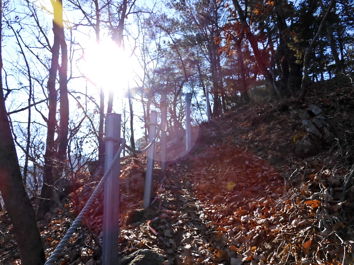 ▲ 등로에 들어서자 말자 낙엽깔린 너덜길이 고개를 바짝 일으켜 세운다.