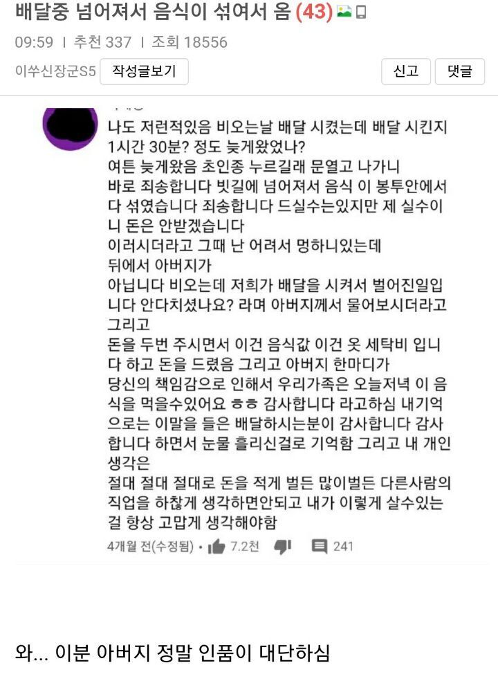 배달중 넘어져서 음식이 섞여서 옴 작성자봉꾸애비|작성시간21.04.02|조회수22 목록 댓글 5 글자크기 작게가 글자크기 크게가 대단한 아버지네요. 본받고 싶습니다. 다음검색 현재 게시글 추가 기능 열기 북마크 공유하기 신고 센터로 신고 댓글 댓글 5 댓글쓰기 답글쓰기 댓글 리스트 작성자눈내리는날 | 작성시간 21.04.02 눈물이 주루룩 작성자감자611 | 작성시간 21.04.02 훌륭한 아버지네요 작성자하늘(뭥미) | 작성시간 21.04.02 세상은 아름답다 작성자숨고르기 | 작성시간 21.04.03 가슴이 찡하네요 정말 휼륭한 분이시군요,,,^^ 작성자소야 | 작성시간 21.04.04 감동입니다 .. 댓글 전체보기