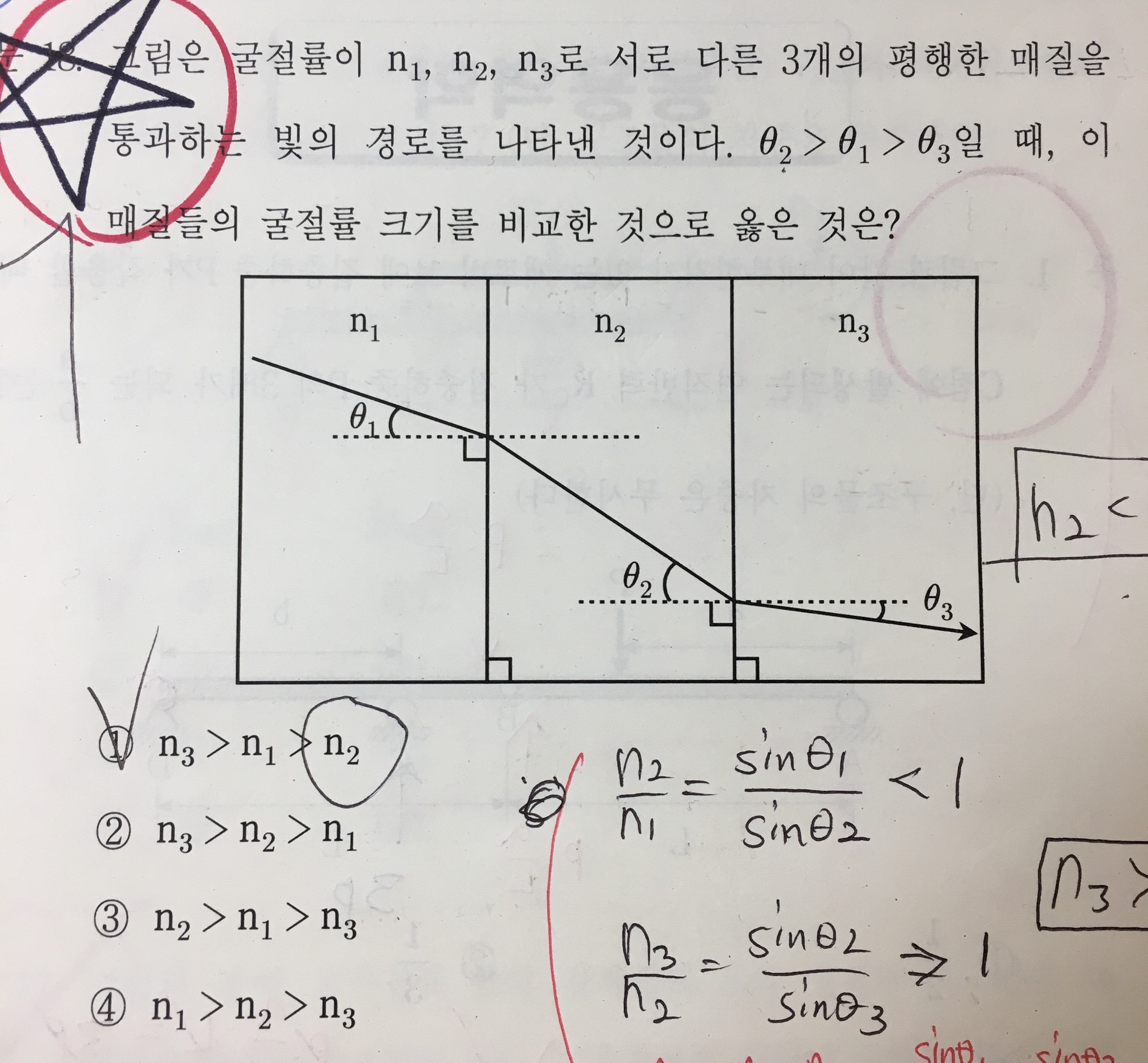 저는 그렇게 하면 안 될 것 같아서 두개씩 묶어서 비교했는데, 그냥 굴절각 크기 반대로 해도 답이 나오네요