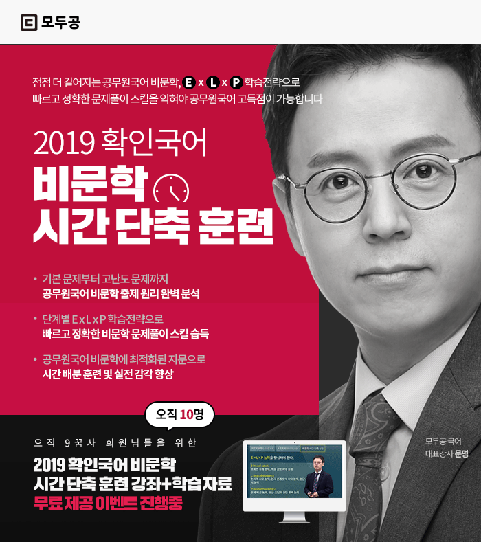 [모두의공무원] 빠르고 정확한 공무원국어 문제풀이 실력 완성! 문명 확인국어 비문학 시간 단축 훈련 강좌 + 학습자료 10명 무료 증정이벤트(마감)