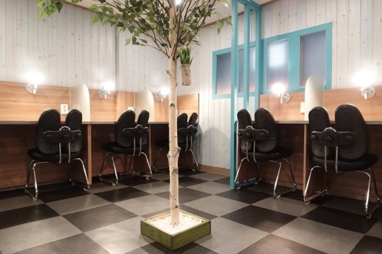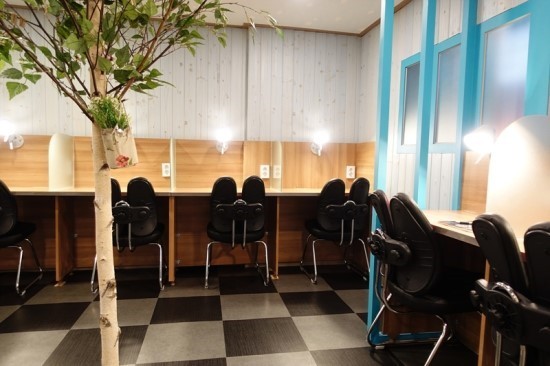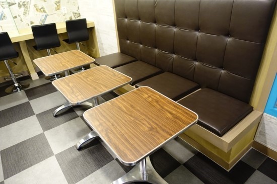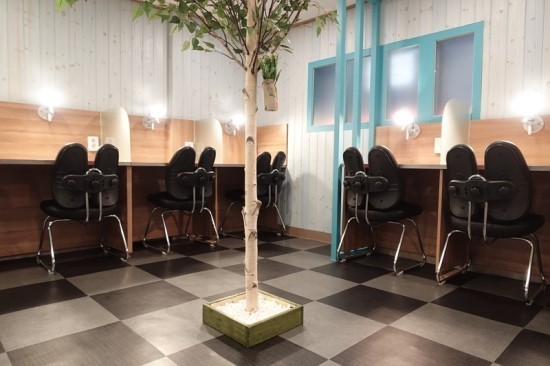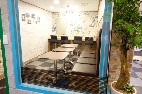 휴게실은 편안한 등받이 쇼파에 1인용 테이블로 되어있어요.