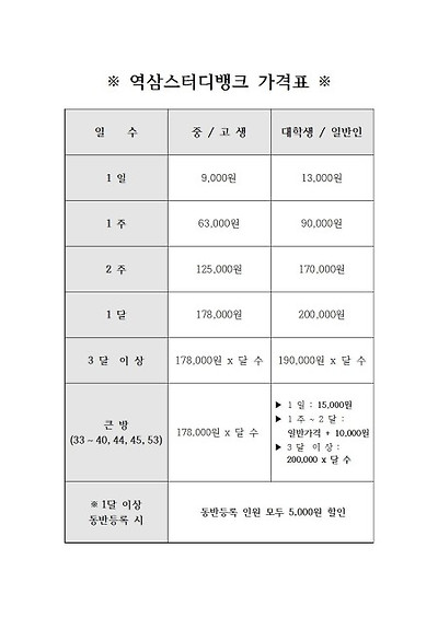 역삼스터디뱅크 독서실 이용료는 아래와 같으니 참고 하시기 바랍니다.