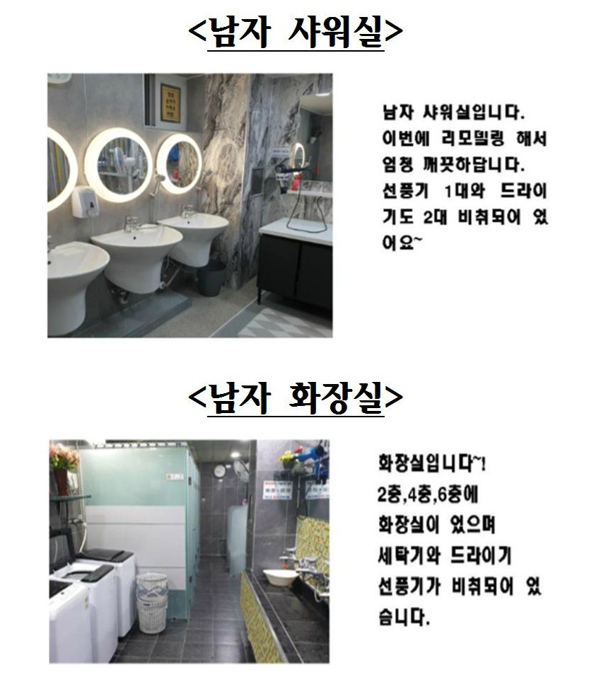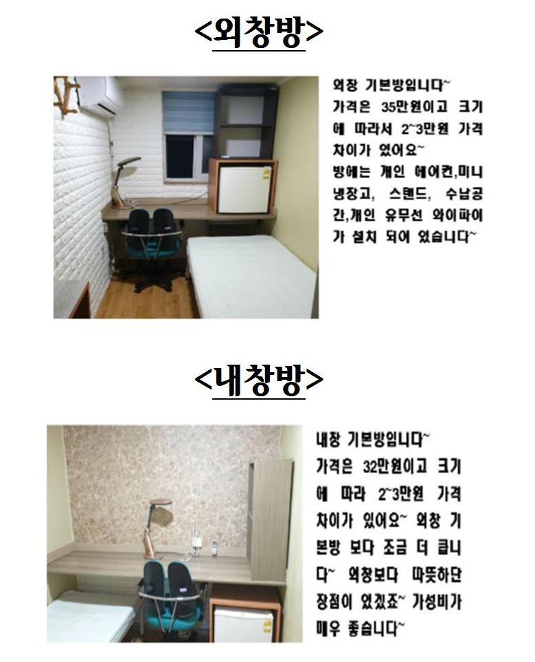 *그외 1. cctv가 30대 가량 설치 및 공용냉장고 비치 1.5 각 방마다 무선인터넷 제공!!!! 2. 방과방은 모두 벽돌 시공 되어 있어서 합판 보다 방음 잘 됩니다~ 3. 프린트물 출력 무료 제공. (출력장수 제한X, 양면인쇄 가능.)