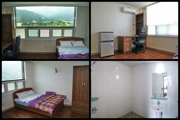 3.책상, 의자, 책장, 공유기, 냉장고, 선풍기, 에어컨, 옷장, 이불, 시트 등 완비