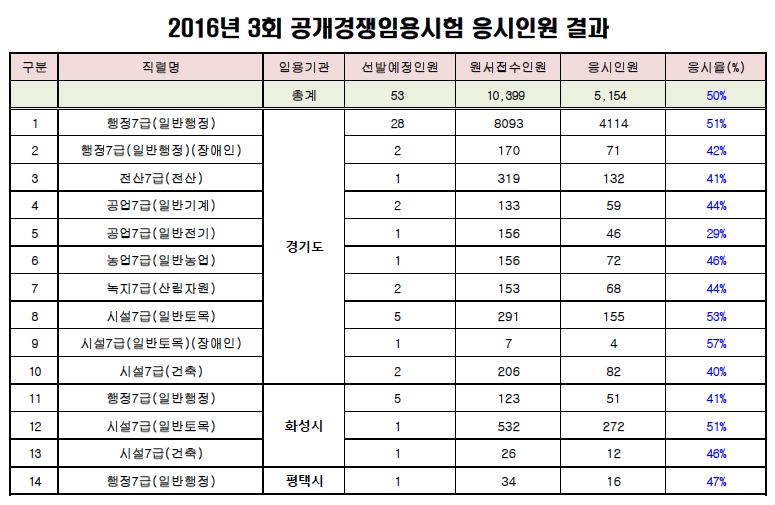 [[경쟁률]]2016 제3회 경기도 지방공무원(7급 등) 임용 필기시험 응시율 작성자♡9꿈이♡|작성시간16.10.11|조회수1,983 목록 댓글 1 글자크기 작게가 글자크기 크게가 다음검색 현재 게시글 추가 기능 열기 북마크 공유하기 신고 센터로 신고 댓글 댓글 1 댓글쓰기 답글쓰기 댓글 리스트 작성자랄롤 | 작성시간 16.10.17 경쟁률 내려간지알았지만 자료에 오류가 있네요 댓글 전체보기