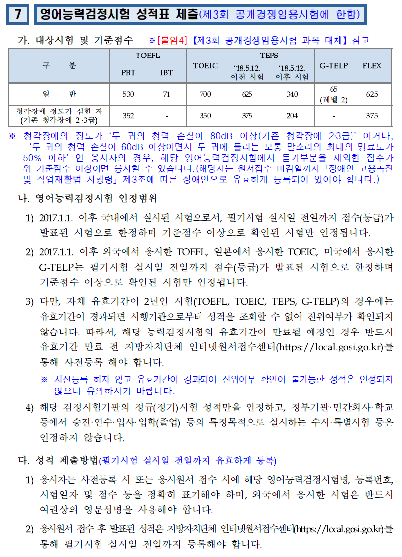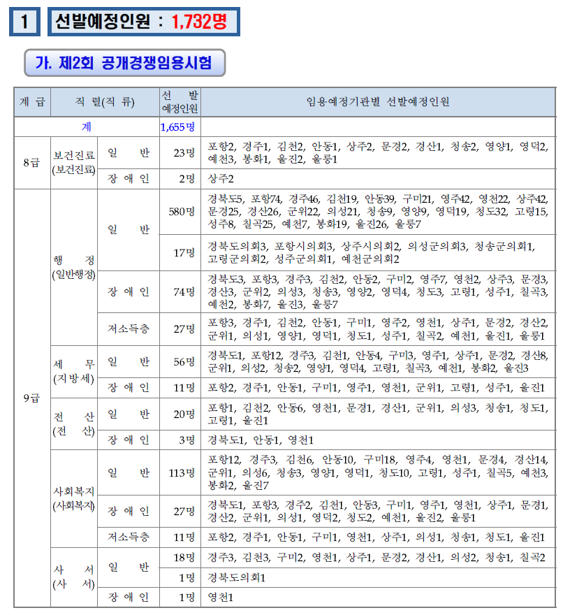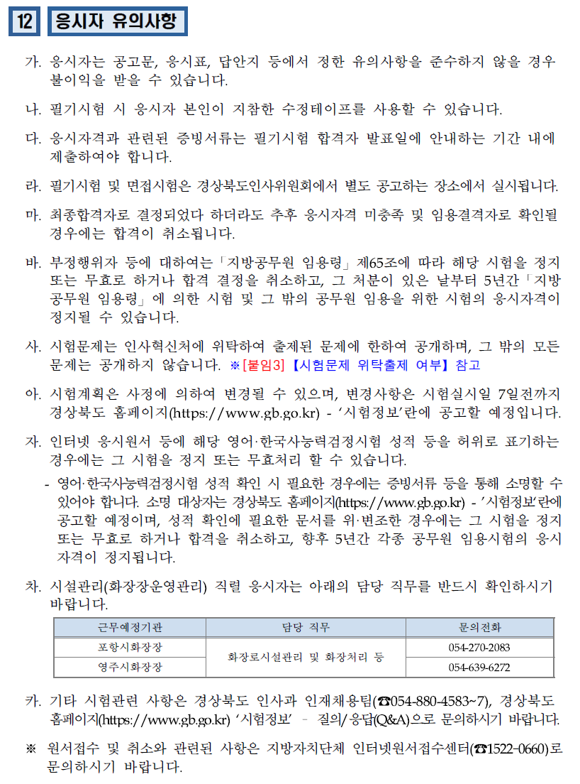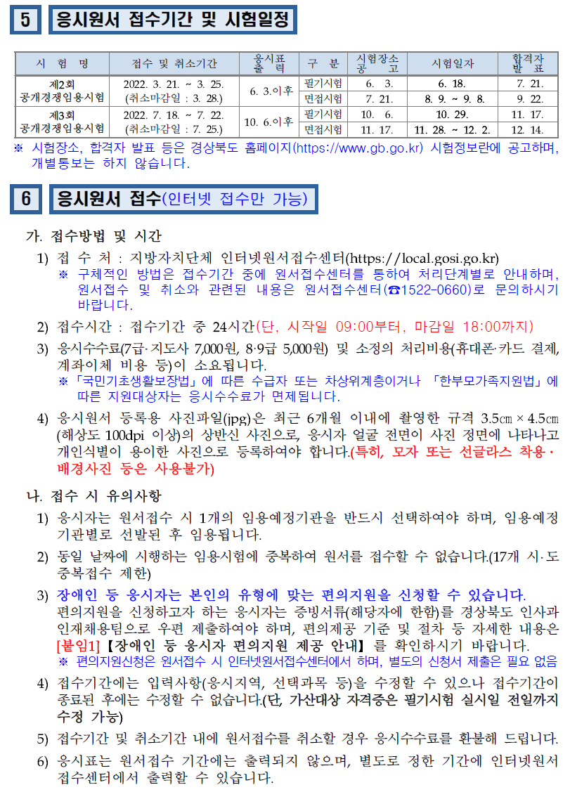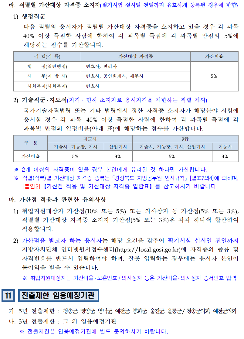 [[시험공고]]2022 경북 지방공무원(7급,9급 등) 임용시험 공고 (9급접수: 3.21~25 / 9급시험: 6.18) 작성자♡9꿈이♡|작성시간22.02.11|조회수9,361 목록 댓글 4 글자크기 작게가 글자크기 크게가 [공고문] 2022년도 경상북도 지방공무원 공개경쟁임용시험 계획 공고.hwp90.00KB[붙임1] 장애인 등 응시자 편의지원 제공 안내.hwp33.50KB[붙임2,3] 가산점 적용 및 가산대상 자격증 일람표, 시험문제 위탁출제 여부.hwp43.00KB[붙임4] 제3회 공개경쟁임용시험 과목 대체.hwp25.50KB 첨부파일첨부된 파일이 18개 있습니다. png 파일 경북 시험공고4.png 다운로드 png 파일 경북 시험공고1.png 다운로드 png 파일 경북 시험공고3.png 다운로드 png 파일 경북 시험공고5.png 다운로드 png 파일 경북 시험공고2.png 다운로드 png 파일 경북 시험공고7.png 다운로드 png 파일 경북 시험공고6.png 다운로드 png 파일 경북 시험공고8.png 다운로드 png 파일 경북 시험공고11.png 다운로드 png 파일 경북 시험공고10.png 다운로드 png 파일 경북 시험공고12.png 다운로드 png 파일 경북 시험공고9.png 다운로드 png 파일 경북 시험공고13.png 다운로드 png 파일 경북 시험공고14.png 다운로드 hwp 파일 [공고문] 2022년도 경상북도 지방공무원 공개경쟁임용시험 계획 공고.hwp 다운로드 hwp 파일 [붙임1] 장애인 등 응시자 편의지원 제공 안내.hwp 다운로드 hwp 파일 [붙임4] 제3회 공개경쟁임용시험 과목 대체.hwp 다운로드 hwp 파일 [붙임2,3] 가산점 적용 및 가산대상 자격증 일람표, 시험문제 위탁출제 여부.hwp 다운로드 다음검색 현재 게시글 추가 기능 열기 북마크 공유하기 신고 센터로 신고 댓글 댓글 4 댓글쓰기 답글쓰기 댓글 리스트 작성자jyw333 | 작성시간 22.02.11 나의 고향으로... 작성자마지막성공 | 작성시간 22.02.15 좋은정보감사해요 작성자ajdgebdje | 작성시간 22.02.16 감사해요 작성자바나나우유ㅇ | 작성시간 22.03.19 감사합니다 댓글 전체보기